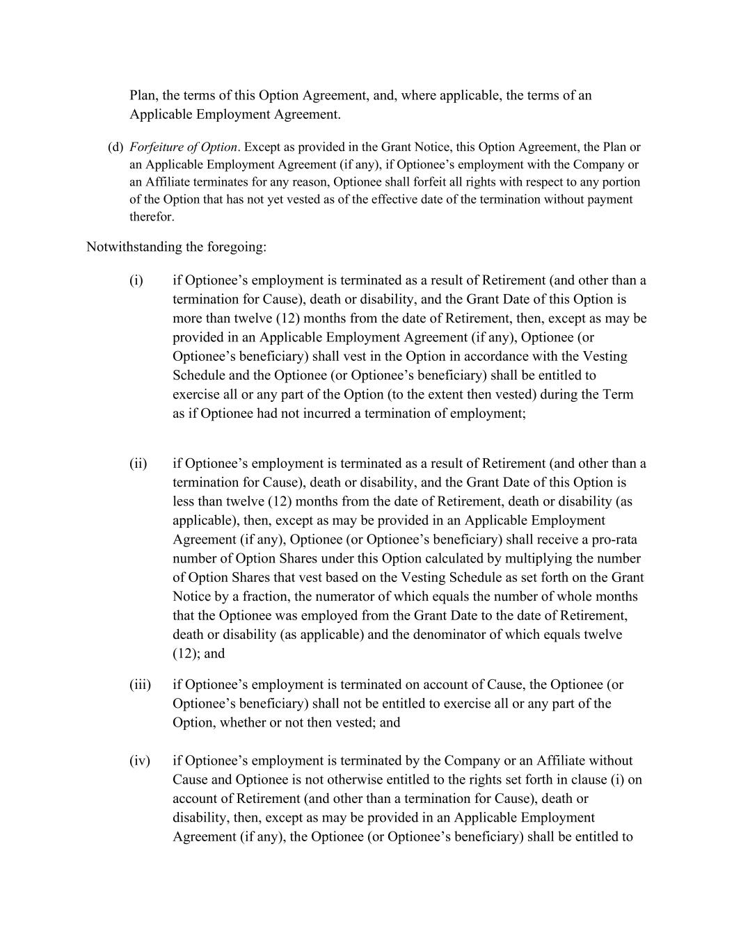 Plan, the terms of this Option Agreement, and, where applicable, the terms of an Applicable Employment Agreement. (d) Forfeiture of Option. Except as provided in the Grant Notice, this Option Agreement, the Plan or an Applicable Employment Agreement (if any), if Optionee’s employment with the Company or an Affiliate terminates for any reason, Optionee shall forfeit all rights with respect to any portion of the Option that has not yet vested as of the effective date of the termination without payment therefor. Notwithstanding the foregoing: (i) if Optionee’s employment is terminated as a result of Retirement (and other than a termination for Cause), death or disability, and the Grant Date of this Option is more than twelve (12) months from the date of Retirement, then, except as may be provided in an Applicable Employment Agreement (if any), Optionee (or Optionee’s beneficiary) shall vest in the Option in accordance with the Vesting Schedule and the Optionee (or Optionee’s beneficiary) shall be entitled to exercise all or any part of the Option (to the extent then vested) during the Term as if Optionee had not incurred a termination of employment; (ii) if Optionee’s employment is terminated as a result of Retirement (and other than a termination for Cause), death or disability, and the Grant Date of this Option is less than twelve (12) months from the date of Retirement, death or disability (as applicable), then, except as may be provided in an Applicable Employment Agreement (if any), Optionee (or Optionee’s beneficiary) shall receive a pro-rata number of Option Shares under this Option calculated by multiplying the number of Option Shares that vest based on the Vesting Schedule as set forth on the Grant Notice by a fraction, the numerator of which equals the number of whole months that the Optionee was employed from the Grant Date to the date of Retirement, death or disability (as applicable) and the denominator of which equals twelve (12); and (iii) if Optionee’s employment is terminated on account of Cause, the Optionee (or Optionee’s beneficiary) shall not be entitled to exercise all or any part of the Option, whether or not then vested; and (iv) if Optionee’s employment is terminated by the Company or an Affiliate without Cause and Optionee is not otherwise entitled to the rights set forth in clause (i) on account of Retirement (and other than a termination for Cause), death or disability, then, except as may be provided in an Applicable Employment Agreement (if any), the Optionee (or Optionee’s beneficiary) shall be entitled to
