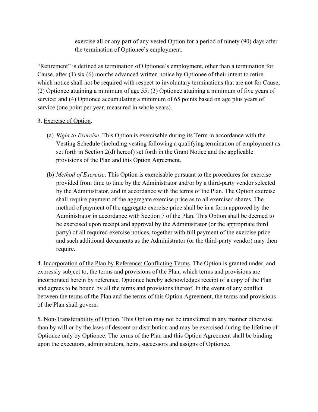 exercise all or any part of any vested Option for a period of ninety (90) days after the termination of Optionee’s employment. “Retirement” is defined as termination of Optionee’s employment, other than a termination for Cause, after (1) six (6) months advanced written notice by Optionee of their intent to retire, which notice shall not be required with respect to involuntary terminations that are not for Cause; (2) Optionee attaining a minimum of age 55; (3) Optionee attaining a minimum of five years of service; and (4) Optionee accumulating a minimum of 65 points based on age plus years of service (one point per year, measured in whole years). 3. Exercise of Option. (a) Right to Exercise. This Option is exercisable during its Term in accordance with the Vesting Schedule (including vesting following a qualifying termination of employment as set forth in Section 2(d) hereof) set forth in the Grant Notice and the applicable provisions of the Plan and this Option Agreement. (b) Method of Exercise. This Option is exercisable pursuant to the procedures for exercise provided from time to time by the Administrator and/or by a third-party vendor selected by the Administrator, and in accordance with the terms of the Plan. The Option exercise shall require payment of the aggregate exercise price as to all exercised shares. The method of payment of the aggregate exercise price shall be in a form approved by the Administrator in accordance with Section 7 of the Plan. This Option shall be deemed to be exercised upon receipt and approval by the Administrator (or the appropriate third party) of all required exercise notices, together with full payment of the exercise price and such additional documents as the Administrator (or the third-party vendor) may then require. 4. Incorporation of the Plan by Reference; Conflicting Terms. The Option is granted under, and expressly subject to, the terms and provisions of the Plan, which terms and provisions are incorporated herein by reference. Optionee hereby acknowledges receipt of a copy of the Plan and agrees to be bound by all the terms and provisions thereof. In the event of any conflict between the terms of the Plan and the terms of this Option Agreement, the terms and provisions of the Plan shall govern. 5. Non-Transferability of Option. This Option may not be transferred in any manner otherwise than by will or by the laws of descent or distribution and may be exercised during the lifetime of Optionee only by Optionee. The terms of the Plan and this Option Agreement shall be binding upon the executors, administrators, heirs, successors and assigns of Optionee.