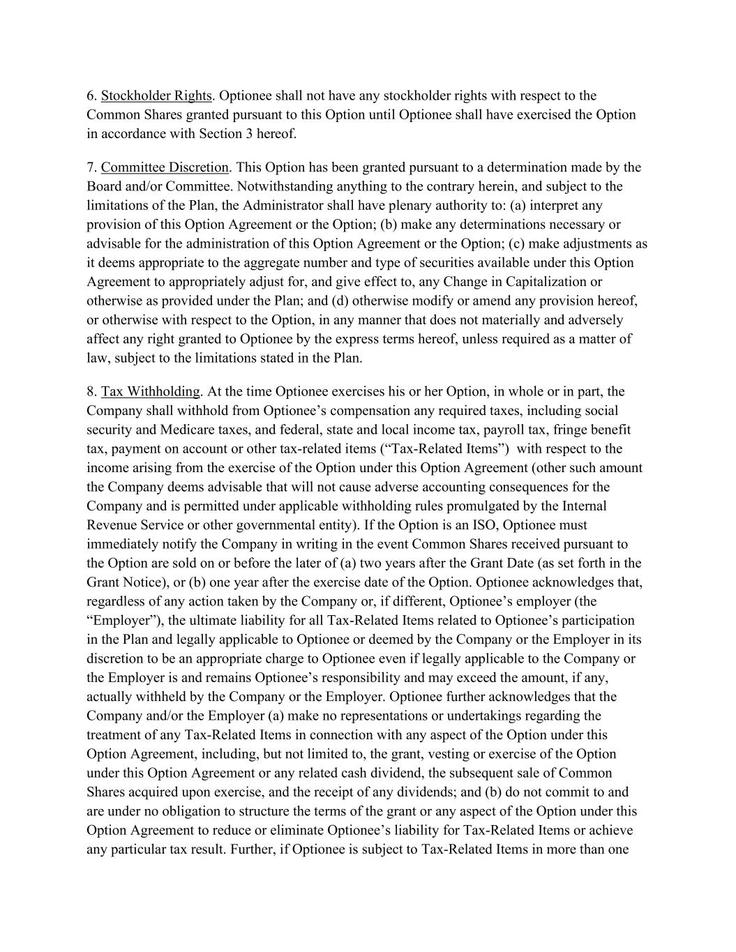 6. Stockholder Rights. Optionee shall not have any stockholder rights with respect to the Common Shares granted pursuant to this Option until Optionee shall have exercised the Option in accordance with Section 3 hereof. 7. Committee Discretion. This Option has been granted pursuant to a determination made by the Board and/or Committee. Notwithstanding anything to the contrary herein, and subject to the limitations of the Plan, the Administrator shall have plenary authority to: (a) interpret any provision of this Option Agreement or the Option; (b) make any determinations necessary or advisable for the administration of this Option Agreement or the Option; (c) make adjustments as it deems appropriate to the aggregate number and type of securities available under this Option Agreement to appropriately adjust for, and give effect to, any Change in Capitalization or otherwise as provided under the Plan; and (d) otherwise modify or amend any provision hereof, or otherwise with respect to the Option, in any manner that does not materially and adversely affect any right granted to Optionee by the express terms hereof, unless required as a matter of law, subject to the limitations stated in the Plan. 8. Tax Withholding. At the time Optionee exercises his or her Option, in whole or in part, the Company shall withhold from Optionee’s compensation any required taxes, including social security and Medicare taxes, and federal, state and local income tax, payroll tax, fringe benefit tax, payment on account or other tax-related items (“Tax-Related Items”) with respect to the income arising from the exercise of the Option under this Option Agreement (other such amount the Company deems advisable that will not cause adverse accounting consequences for the Company and is permitted under applicable withholding rules promulgated by the Internal Revenue Service or other governmental entity). If the Option is an ISO, Optionee must immediately notify the Company in writing in the event Common Shares received pursuant to the Option are sold on or before the later of (a) two years after the Grant Date (as set forth in the Grant Notice), or (b) one year after the exercise date of the Option. Optionee acknowledges that, regardless of any action taken by the Company or, if different, Optionee’s employer (the “Employer”), the ultimate liability for all Tax-Related Items related to Optionee’s participation in the Plan and legally applicable to Optionee or deemed by the Company or the Employer in its discretion to be an appropriate charge to Optionee even if legally applicable to the Company or the Employer is and remains Optionee’s responsibility and may exceed the amount, if any, actually withheld by the Company or the Employer. Optionee further acknowledges that the Company and/or the Employer (a) make no representations or undertakings regarding the treatment of any Tax-Related Items in connection with any aspect of the Option under this Option Agreement, including, but not limited to, the grant, vesting or exercise of the Option under this Option Agreement or any related cash dividend, the subsequent sale of Common Shares acquired upon exercise, and the receipt of any dividends; and (b) do not commit to and are under no obligation to structure the terms of the grant or any aspect of the Option under this Option Agreement to reduce or eliminate Optionee’s liability for Tax-Related Items or achieve any particular tax result. Further, if Optionee is subject to Tax-Related Items in more than one