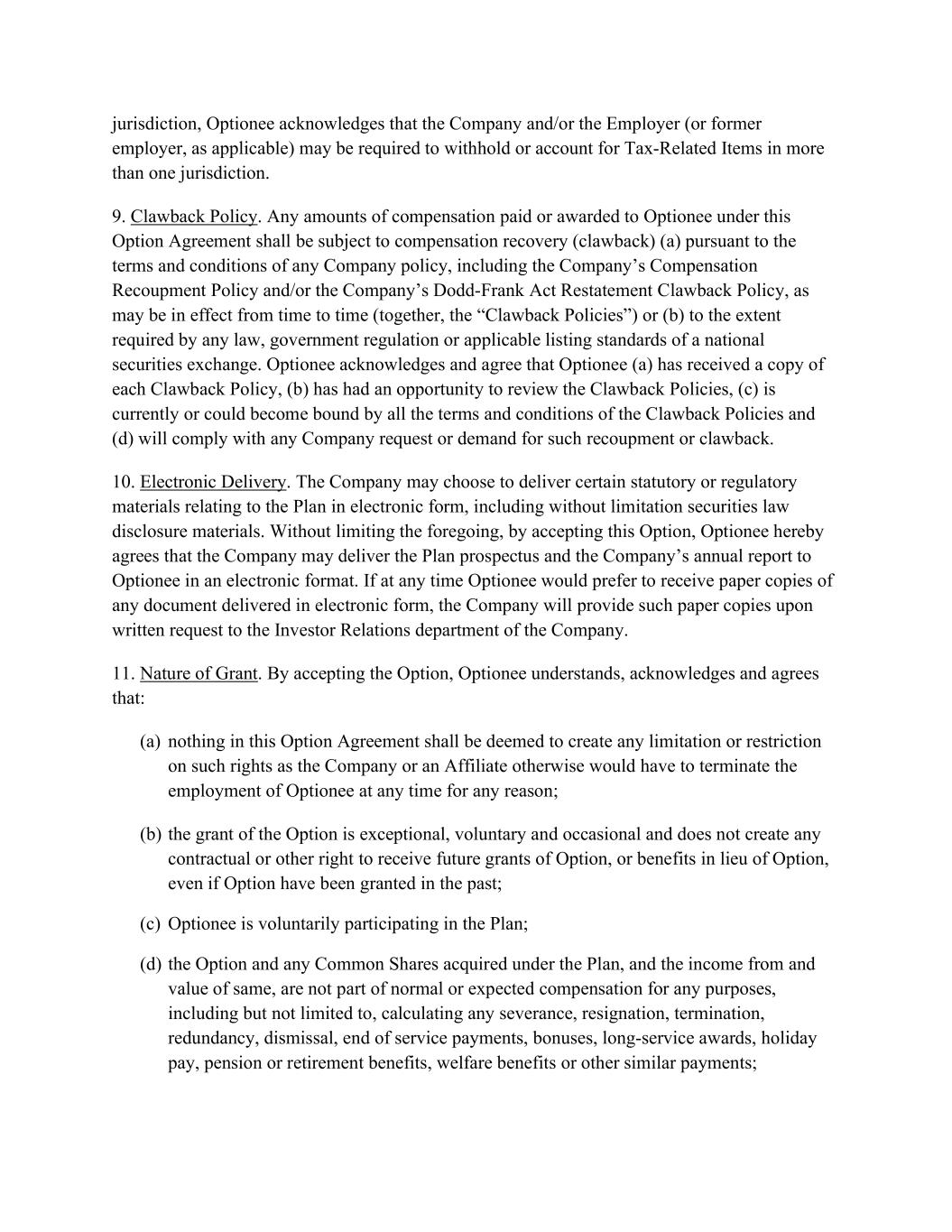 jurisdiction, Optionee acknowledges that the Company and/or the Employer (or former employer, as applicable) may be required to withhold or account for Tax-Related Items in more than one jurisdiction. 9. Clawback Policy. Any amounts of compensation paid or awarded to Optionee under this Option Agreement shall be subject to compensation recovery (clawback) (a) pursuant to the terms and conditions of any Company policy, including the Company’s Compensation Recoupment Policy and/or the Company’s Dodd-Frank Act Restatement Clawback Policy, as may be in effect from time to time (together, the “Clawback Policies”) or (b) to the extent required by any law, government regulation or applicable listing standards of a national securities exchange. Optionee acknowledges and agree that Optionee (a) has received a copy of each Clawback Policy, (b) has had an opportunity to review the Clawback Policies, (c) is currently or could become bound by all the terms and conditions of the Clawback Policies and (d) will comply with any Company request or demand for such recoupment or clawback. 10. Electronic Delivery. The Company may choose to deliver certain statutory or regulatory materials relating to the Plan in electronic form, including without limitation securities law disclosure materials. Without limiting the foregoing, by accepting this Option, Optionee hereby agrees that the Company may deliver the Plan prospectus and the Company’s annual report to Optionee in an electronic format. If at any time Optionee would prefer to receive paper copies of any document delivered in electronic form, the Company will provide such paper copies upon written request to the Investor Relations department of the Company. 11. Nature of Grant. By accepting the Option, Optionee understands, acknowledges and agrees that: (a) nothing in this Option Agreement shall be deemed to create any limitation or restriction on such rights as the Company or an Affiliate otherwise would have to terminate the employment of Optionee at any time for any reason; (b) the grant of the Option is exceptional, voluntary and occasional and does not create any contractual or other right to receive future grants of Option, or benefits in lieu of Option, even if Option have been granted in the past; (c) Optionee is voluntarily participating in the Plan; (d) the Option and any Common Shares acquired under the Plan, and the income from and value of same, are not part of normal or expected compensation for any purposes, including but not limited to, calculating any severance, resignation, termination, redundancy, dismissal, end of service payments, bonuses, long-service awards, holiday pay, pension or retirement benefits, welfare benefits or other similar payments;