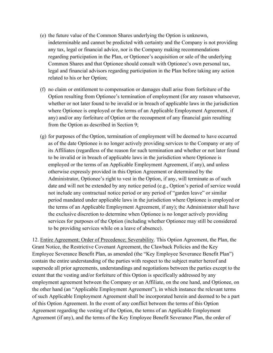 (e) the future value of the Common Shares underlying the Option is unknown, indeterminable and cannot be predicted with certainty and the Company is not providing any tax, legal or financial advice, nor is the Company making recommendations regarding participation in the Plan, or Optionee’s acquisition or sale of the underlying Common Shares and that Optionee should consult with Optionee’s own personal tax, legal and financial advisors regarding participation in the Plan before taking any action related to his or her Option; (f) no claim or entitlement to compensation or damages shall arise from forfeiture of the Option resulting from Optionee’s termination of employment (for any reason whatsoever, whether or not later found to be invalid or in breach of applicable laws in the jurisdiction where Optionee is employed or the terms of an Applicable Employment Agreement, if any) and/or any forfeiture of Option or the recoupment of any financial gain resulting from the Option as described in Section 9; (g) for purposes of the Option, termination of employment will be deemed to have occurred as of the date Optionee is no longer actively providing services to the Company or any of its Affiliates (regardless of the reason for such termination and whether or not later found to be invalid or in breach of applicable laws in the jurisdiction where Optionee is employed or the terms of an Applicable Employment Agreement, if any), and unless otherwise expressly provided in this Option Agreement or determined by the Administrator, Optionee’s right to vest in the Option, if any, will terminate as of such date and will not be extended by any notice period (e.g., Option’s period of service would not include any contractual notice period or any period of “garden leave” or similar period mandated under applicable laws in the jurisdiction where Optionee is employed or the terms of an Applicable Employment Agreement, if any); the Administrator shall have the exclusive discretion to determine when Optionee is no longer actively providing services for purposes of the Option (including whether Optionee may still be considered to be providing services while on a leave of absence). 12. Entire Agreement; Order of Precedence; Severability. This Option Agreement, the Plan, the Grant Notice, the Restrictive Covenant Agreement, the Clawback Policies and the Key Employee Severance Benefit Plan, as amended (the “Key Employee Severance Benefit Plan”) contain the entire understanding of the parties with respect to the subject matter hereof and supersede all prior agreements, understandings and negotiations between the parties except to the extent that the vesting and/or forfeiture of this Option is specifically addressed by any employment agreement between the Company or an Affiliate, on the one hand, and Optionee, on the other hand (an “Applicable Employment Agreement”), in which instance the relevant terms of such Applicable Employment Agreement shall be incorporated herein and deemed to be a part of this Option Agreement. In the event of any conflict between the terms of this Option Agreement regarding the vesting of the Option, the terms of an Applicable Employment Agreement (if any), and the terms of the Key Employee Benefit Severance Plan, the order of