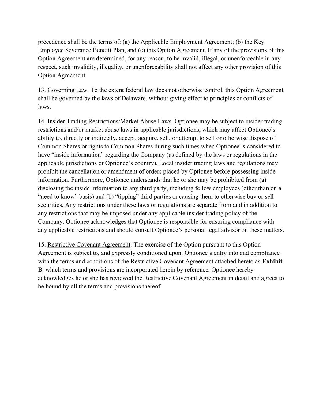 precedence shall be the terms of: (a) the Applicable Employment Agreement; (b) the Key Employee Severance Benefit Plan, and (c) this Option Agreement. If any of the provisions of this Option Agreement are determined, for any reason, to be invalid, illegal, or unenforceable in any respect, such invalidity, illegality, or unenforceability shall not affect any other provision of this Option Agreement. 13. Governing Law. To the extent federal law does not otherwise control, this Option Agreement shall be governed by the laws of Delaware, without giving effect to principles of conflicts of laws. 14. Insider Trading Restrictions/Market Abuse Laws. Optionee may be subject to insider trading restrictions and/or market abuse laws in applicable jurisdictions, which may affect Optionee’s ability to, directly or indirectly, accept, acquire, sell, or attempt to sell or otherwise dispose of Common Shares or rights to Common Shares during such times when Optionee is considered to have “inside information” regarding the Company (as defined by the laws or regulations in the applicable jurisdictions or Optionee’s country). Local insider trading laws and regulations may prohibit the cancellation or amendment of orders placed by Optionee before possessing inside information. Furthermore, Optionee understands that he or she may be prohibited from (a) disclosing the inside information to any third party, including fellow employees (other than on a “need to know” basis) and (b) “tipping” third parties or causing them to otherwise buy or sell securities. Any restrictions under these laws or regulations are separate from and in addition to any restrictions that may be imposed under any applicable insider trading policy of the Company. Optionee acknowledges that Optionee is responsible for ensuring compliance with any applicable restrictions and should consult Optionee’s personal legal advisor on these matters. 15. Restrictive Covenant Agreement. The exercise of the Option pursuant to this Option Agreement is subject to, and expressly conditioned upon, Optionee’s entry into and compliance with the terms and conditions of the Restrictive Covenant Agreement attached hereto as Exhibit B, which terms and provisions are incorporated herein by reference. Optionee hereby acknowledges he or she has reviewed the Restrictive Covenant Agreement in detail and agrees to be bound by all the terms and provisions thereof.