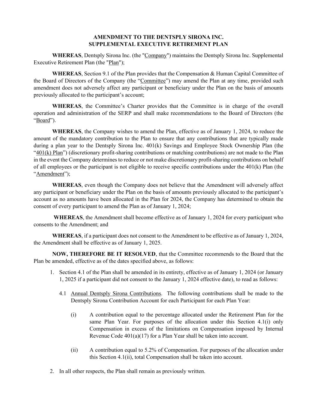 AMENDMENT TO THE DENTSPLY SIRONA INC. SUPPLEMENTAL EXECUTIVE RETIREMENT PLAN WHEREAS, Dentsply Sirona Inc. (the "Company") maintains the Dentsply Sirona Inc. Supplemental Executive Retirement Plan (the "Plan"); WHEREAS, Section 9.1 of the Plan provides that the Compensation & Human Capital Committee of the Board of Directors of the Company (the “Committee”) may amend the Plan at any time, provided such amendment does not adversely affect any participant or beneficiary under the Plan on the basis of amounts previously allocated to the participant’s account; WHEREAS, the Committee’s Charter provides that the Committee is in charge of the overall operation and administration of the SERP and shall make recommendations to the Board of Directors (the “Board”). WHEREAS, the Company wishes to amend the Plan, effective as of January 1, 2024, to reduce the amount of the mandatory contribution to the Plan to ensure that any contributions that are typically made during a plan year to the Dentsply Sirona Inc. 401(k) Savings and Employee Stock Ownership Plan (the “401(k) Plan”) (discretionary profit-sharing contributions or matching contributions) are not made to the Plan in the event the Company determines to reduce or not make discretionary profit-sharing contributions on behalf of all employees or the participant is not eligible to receive specific contributions under the 401(k) Plan (the “Amendment”); WHEREAS, even though the Company does not believe that the Amendment will adversely affect any participant or beneficiary under the Plan on the basis of amounts previously allocated to the participant’s account as no amounts have been allocated in the Plan for 2024, the Company has determined to obtain the consent of every participant to amend the Plan as of January 1, 2024; WHEREAS, the Amendment shall become effective as of January 1, 2024 for every participant who consents to the Amendment; and WHEREAS, if a participant does not consent to the Amendment to be effective as of January 1, 2024, the Amendment shall be effective as of January 1, 2025. NOW, THEREFORE BE IT RESOLVED, that the Committee recommends to the Board that the Plan be amended, effective as of the dates specified above, as follows: 1. Section 4.1 of the Plan shall be amended in its entirety, effective as of January 1, 2024 (or January 1, 2025 if a participant did not consent to the January 1, 2024 effective date), to read as follows: 4.1 Annual Dentsply Sirona Contributions. The following contributions shall be made to the Dentsply Sirona Contribution Account for each Participant for each Plan Year: (i) A contribution equal to the percentage allocated under the Retirement Plan for the same Plan Year. For purposes of the allocation under this Section 4.1(i) only Compensation in excess of the limitations on Compensation imposed by Internal Revenue Code 401(a)(17) for a Plan Year shall be taken into account. (ii) A contribution equal to 5.2% of Compensation. For purposes of the allocation under this Section 4.1(ii), total Compensation shall be taken into account. 2. In all other respects, the Plan shall remain as previously written.
