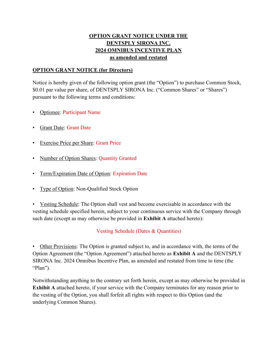 OPTION GRANT NOTICE UNDER THE DENTSPLY SIRONA INC. 2024 OMNIBUS INCENTIVE PLAN as amended and restated OPTION GRANT NOTICE (for Directors) Notice is hereby given of the following option grant (the “Option”) to purchase Common Stock, $0.01 par value per share, of DENTSPLY SIRONA Inc. (“Common Shares” or “Shares”) pursuant to the following terms and conditions: • Optionee: Participant Name • Grant Date: Grant Date • Exercise Price per Share: Grant Price • Number of Option Shares: Quantity Granted • Term/Expiration Date of Option: Expiration Date • Type of Option: Non-Qualified Stock Option • Vesting Schedule: The Option shall vest and become exercisable in accordance with the vesting schedule specified herein, subject to your continuous service with the Company through such date (except as may otherwise be provided in Exhibit A attached hereto): Vesting Schedule (Dates & Quantities) • Other Provisions: The Option is granted subject to, and in accordance with, the terms of the Option Agreement (the “Option Agreement”) attached hereto as Exhibit A and the DENTSPLY SIRONA Inc. 2024 Omnibus Incentive Plan, as amended and restated from time to time (the “Plan”). Notwithstanding anything to the contrary set forth herein, except as may otherwise be provided in Exhibit A attached hereto, if your service with the Company terminates for any reason prior to the vesting of the Option, you shall forfeit all rights with respect to this Option (and the underlying Common Shares).