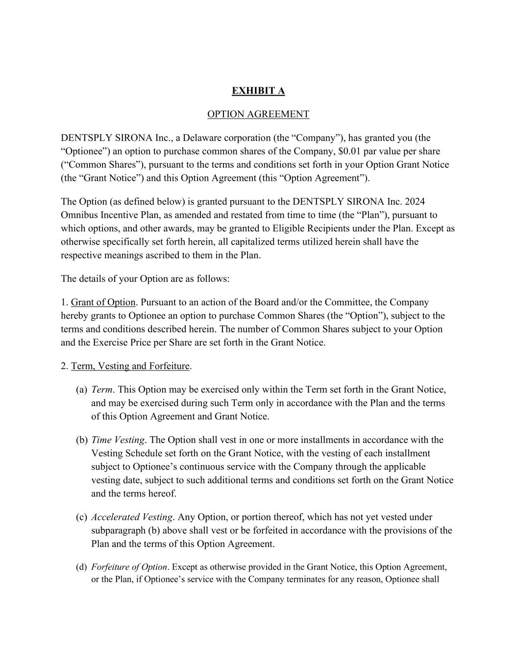 EXHIBIT A OPTION AGREEMENT DENTSPLY SIRONA Inc., a Delaware corporation (the “Company”), has granted you (the “Optionee”) an option to purchase common shares of the Company, $0.01 par value per share (“Common Shares”), pursuant to the terms and conditions set forth in your Option Grant Notice (the “Grant Notice”) and this Option Agreement (this “Option Agreement”). The Option (as defined below) is granted pursuant to the DENTSPLY SIRONA Inc. 2024 Omnibus Incentive Plan, as amended and restated from time to time (the “Plan”), pursuant to which options, and other awards, may be granted to Eligible Recipients under the Plan. Except as otherwise specifically set forth herein, all capitalized terms utilized herein shall have the respective meanings ascribed to them in the Plan. The details of your Option are as follows: 1. Grant of Option. Pursuant to an action of the Board and/or the Committee, the Company hereby grants to Optionee an option to purchase Common Shares (the “Option”), subject to the terms and conditions described herein. The number of Common Shares subject to your Option and the Exercise Price per Share are set forth in the Grant Notice. 2. Term, Vesting and Forfeiture. (a) Term. This Option may be exercised only within the Term set forth in the Grant Notice, and may be exercised during such Term only in accordance with the Plan and the terms of this Option Agreement and Grant Notice. (b) Time Vesting. The Option shall vest in one or more installments in accordance with the Vesting Schedule set forth on the Grant Notice, with the vesting of each installment subject to Optionee’s continuous service with the Company through the applicable vesting date, subject to such additional terms and conditions set forth on the Grant Notice and the terms hereof. (c) Accelerated Vesting. Any Option, or portion thereof, which has not yet vested under subparagraph (b) above shall vest or be forfeited in accordance with the provisions of the Plan and the terms of this Option Agreement. (d) Forfeiture of Option. Except as otherwise provided in the Grant Notice, this Option Agreement, or the Plan, if Optionee’s service with the Company terminates for any reason, Optionee shall