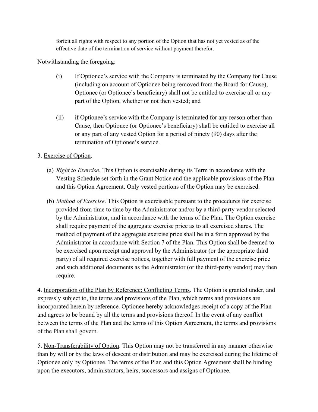 forfeit all rights with respect to any portion of the Option that has not yet vested as of the effective date of the termination of service without payment therefor. Notwithstanding the foregoing: (i) If Optionee’s service with the Company is terminated by the Company for Cause (including on account of Optionee being removed from the Board for Cause), Optionee (or Optionee’s beneficiary) shall not be entitled to exercise all or any part of the Option, whether or not then vested; and (ii) if Optionee’s service with the Company is terminated for any reason other than Cause, then Optionee (or Optionee’s beneficiary) shall be entitled to exercise all or any part of any vested Option for a period of ninety (90) days after the termination of Optionee’s service. 3. Exercise of Option. (a) Right to Exercise. This Option is exercisable during its Term in accordance with the Vesting Schedule set forth in the Grant Notice and the applicable provisions of the Plan and this Option Agreement. Only vested portions of the Option may be exercised. (b) Method of Exercise. This Option is exercisable pursuant to the procedures for exercise provided from time to time by the Administrator and/or by a third-party vendor selected by the Administrator, and in accordance with the terms of the Plan. The Option exercise shall require payment of the aggregate exercise price as to all exercised shares. The method of payment of the aggregate exercise price shall be in a form approved by the Administrator in accordance with Section 7 of the Plan. This Option shall be deemed to be exercised upon receipt and approval by the Administrator (or the appropriate third party) of all required exercise notices, together with full payment of the exercise price and such additional documents as the Administrator (or the third-party vendor) may then require. 4. Incorporation of the Plan by Reference; Conflicting Terms. The Option is granted under, and expressly subject to, the terms and provisions of the Plan, which terms and provisions are incorporated herein by reference. Optionee hereby acknowledges receipt of a copy of the Plan and agrees to be bound by all the terms and provisions thereof. In the event of any conflict between the terms of the Plan and the terms of this Option Agreement, the terms and provisions of the Plan shall govern. 5. Non-Transferability of Option. This Option may not be transferred in any manner otherwise than by will or by the laws of descent or distribution and may be exercised during the lifetime of Optionee only by Optionee. The terms of the Plan and this Option Agreement shall be binding upon the executors, administrators, heirs, successors and assigns of Optionee.