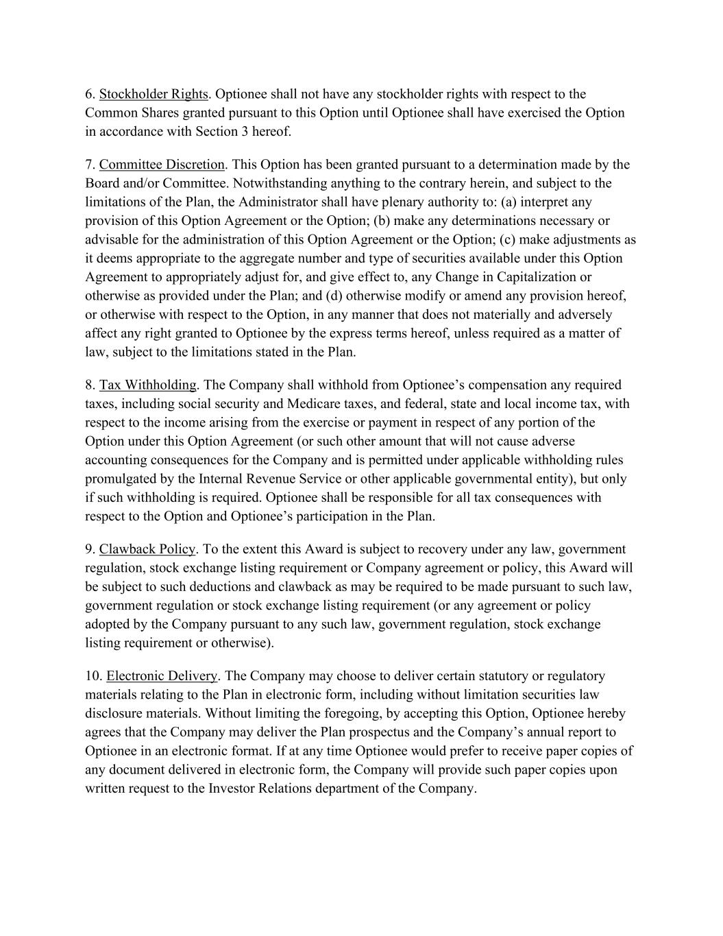 6. Stockholder Rights. Optionee shall not have any stockholder rights with respect to the Common Shares granted pursuant to this Option until Optionee shall have exercised the Option in accordance with Section 3 hereof. 7. Committee Discretion. This Option has been granted pursuant to a determination made by the Board and/or Committee. Notwithstanding anything to the contrary herein, and subject to the limitations of the Plan, the Administrator shall have plenary authority to: (a) interpret any provision of this Option Agreement or the Option; (b) make any determinations necessary or advisable for the administration of this Option Agreement or the Option; (c) make adjustments as it deems appropriate to the aggregate number and type of securities available under this Option Agreement to appropriately adjust for, and give effect to, any Change in Capitalization or otherwise as provided under the Plan; and (d) otherwise modify or amend any provision hereof, or otherwise with respect to the Option, in any manner that does not materially and adversely affect any right granted to Optionee by the express terms hereof, unless required as a matter of law, subject to the limitations stated in the Plan. 8. Tax Withholding. The Company shall withhold from Optionee’s compensation any required taxes, including social security and Medicare taxes, and federal, state and local income tax, with respect to the income arising from the exercise or payment in respect of any portion of the Option under this Option Agreement (or such other amount that will not cause adverse accounting consequences for the Company and is permitted under applicable withholding rules promulgated by the Internal Revenue Service or other applicable governmental entity), but only if such withholding is required. Optionee shall be responsible for all tax consequences with respect to the Option and Optionee’s participation in the Plan. 9. Clawback Policy. To the extent this Award is subject to recovery under any law, government regulation, stock exchange listing requirement or Company agreement or policy, this Award will be subject to such deductions and clawback as may be required to be made pursuant to such law, government regulation or stock exchange listing requirement (or any agreement or policy adopted by the Company pursuant to any such law, government regulation, stock exchange listing requirement or otherwise). 10. Electronic Delivery. The Company may choose to deliver certain statutory or regulatory materials relating to the Plan in electronic form, including without limitation securities law disclosure materials. Without limiting the foregoing, by accepting this Option, Optionee hereby agrees that the Company may deliver the Plan prospectus and the Company’s annual report to Optionee in an electronic format. If at any time Optionee would prefer to receive paper copies of any document delivered in electronic form, the Company will provide such paper copies upon written request to the Investor Relations department of the Company.