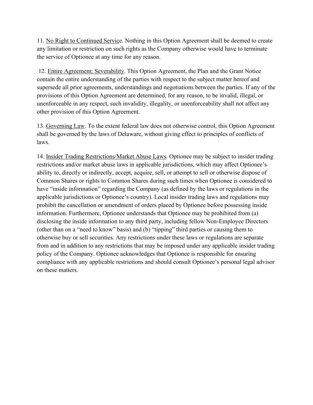 11. No Right to Continued Service. Nothing in this Option Agreement shall be deemed to create any limitation or restriction on such rights as the Company otherwise would have to terminate the service of Optionee at any time for any reason. 12. Entire Agreement; Severability. This Option Agreement, the Plan and the Grant Notice contain the entire understanding of the parties with respect to the subject matter hereof and supersede all prior agreements, understandings and negotiations between the parties. If any of the provisions of this Option Agreement are determined, for any reason, to be invalid, illegal, or unenforceable in any respect, such invalidity, illegality, or unenforceability shall not affect any other provision of this Option Agreement. 13. Governing Law. To the extent federal law does not otherwise control, this Option Agreement shall be governed by the laws of Delaware, without giving effect to principles of conflicts of laws. 14. Insider Trading Restrictions/Market Abuse Laws. Optionee may be subject to insider trading restrictions and/or market abuse laws in applicable jurisdictions, which may affect Optionee’s ability to, directly or indirectly, accept, acquire, sell, or attempt to sell or otherwise dispose of Common Shares or rights to Common Shares during such times when Optionee is considered to have “inside information” regarding the Company (as defined by the laws or regulations in the applicable jurisdictions or Optionee’s country). Local insider trading laws and regulations may prohibit the cancellation or amendment of orders placed by Optionee before possessing inside information. Furthermore, Optionee understands that Optionee may be prohibited from (a) disclosing the inside information to any third party, including fellow Non-Employee Directors (other than on a “need to know” basis) and (b) “tipping” third parties or causing them to otherwise buy or sell securities. Any restrictions under these laws or regulations are separate from and in addition to any restrictions that may be imposed under any applicable insider trading policy of the Company. Optionee acknowledges that Optionee is responsible for ensuring compliance with any applicable restrictions and should consult Optionee’s personal legal advisor on these matters.