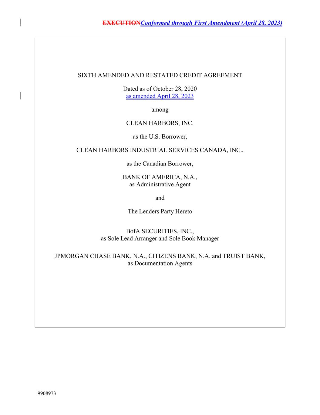 EXECUTIONConformed through First Amendment (April 28, 2023) 9908973 SIXTH AMENDED AND RESTATED CREDIT AGREEMENT Dated as of October 28, 2020 as amended April 28, 2023 among CLEAN HARBORS, INC. as the U.S. Borrower, CLEAN HARBORS INDUSTRIAL SERVICES CANADA, INC., as the Canadian Borrower, BANK OF AMERICA, N.A., as Administrative Agent and The Lenders Party Hereto BofA SECURITIES, INC., as Sole Lead Arranger and Sole Book Manager JPMORGAN CHASE BANK, N.A., CITIZENS BANK, N.A. and TRUIST BANK, as Documentation Agents