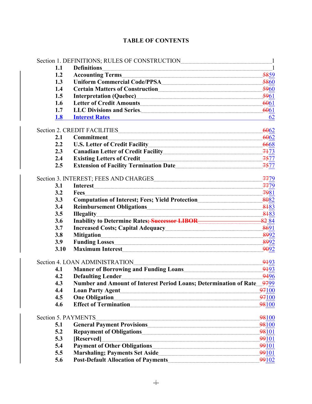 TABLE OF CONTENTS Section 1. DEFINITIONS; RULES OF CONSTRUCTION 1 1.1 Definitions 1 1.2 Accounting Terms 5859 1.3 Uniform Commercial Code/PPSA 5860 1.4 Certain Matters of Construction 5960 1.5 Interpretation (Quebec) 5961 1.6 Letter of Credit Amounts 6061 1.7 LLC Divisions and Series. 6061 1.8 Interest Rates 62 Section 2. CREDIT FACILITIES 6062 2.1 Commitment 6062 2.2 U.S. Letter of Credit Facility 6668 2.3 Canadian Letter of Credit Facility 7173 2.4 Existing Letters of Credit 7577 2.5 Extension of Facility Termination Date 7577 Section 3. INTEREST; FEES AND CHARGES 7779 3.1 Interest 7779 3.2 Fees 7981 3.3 Computation of Interest; Fees; Yield Protection 8082 3.4 Reimbursement Obligations 8183 3.5 Illegality 8183 3.6 Inability to Determine Rates; Successor LIBOR 82 84 3.7 Increased Costs; Capital Adequacy 8691 3.8 Mitigation 8992 3.9 Funding Losses 8992 3.10 Maximum Interest 9092 Section 4. LOAN ADMINISTRATION 9193 4.1 Manner of Borrowing and Funding Loans 9193 4.2 Defaulting Lender 9496 4.3 Number and Amount of Interest Period Loans; Determination of Rate 9799 4.4 Loan Party Agent 97100 4.5 One Obligation 97100 4.6 Effect of Termination 98100 Section 5. PAYMENTS 98100 5.1 General Payment Provisions 98100 5.2 Repayment of Obligations 98101 5.3 [Reserved] 99101 5.4 Payment of Other Obligations 99101 5.5 Marshaling; Payments Set Aside 99101 5.6 Post-Default Allocation of Payments 99102 -i-