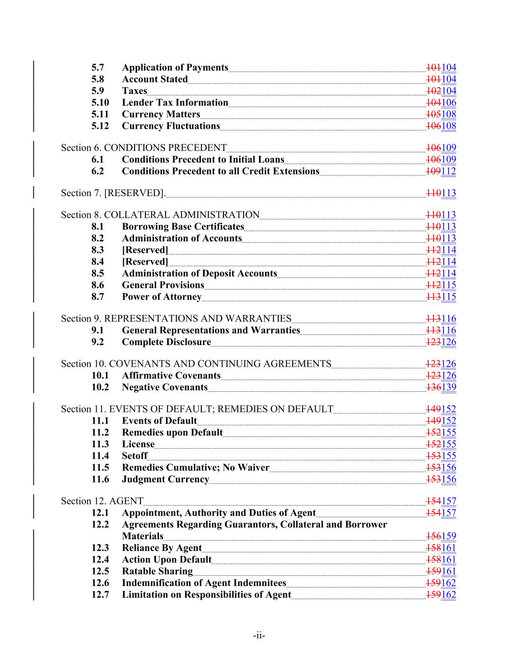 -ii- 5.7 Application of Payments 101104 5.8 Account Stated 101104 5.9 Taxes 102104 5.10 Lender Tax Information 104106 5.11 Currency Matters 105108 5.12 Currency Fluctuations 106108 Section 6. CONDITIONS PRECEDENT 106109 6.1 Conditions Precedent to Initial Loans 106109 6.2 Conditions Precedent to all Credit Extensions 109112 Section 7. [RESERVED]. 110113 Section 8. COLLATERAL ADMINISTRATION 110113 8.1 Borrowing Base Certificates 110113 8.2 Administration of Accounts 110113 8.3 [Reserved] 112114 8.4 [Reserved] 112114 8.5 Administration of Deposit Accounts 112114 8.6 General Provisions 112115 8.7 Power of Attorney 113115 Section 9. REPRESENTATIONS AND WARRANTIES 113116 9.1 General Representations and Warranties 113116 9.2 Complete Disclosure 123126 Section 10. COVENANTS AND CONTINUING AGREEMENTS 123126 10.1 Affirmative Covenants 123126 10.2 Negative Covenants 136139 Section 11. EVENTS OF DEFAULT; REMEDIES ON DEFAULT 149152 11.1 Events of Default 149152 11.2 Remedies upon Default 152155 11.3 License 152155 11.4 Setoff 153155 11.5 Remedies Cumulative; No Waiver 153156 11.6 Judgment Currency 153156 Section 12. AGENT 154157 12.1 Appointment, Authority and Duties of Agent 154157 12.2 Agreements Regarding Guarantors, Collateral and Borrower Materials 156159 12.3 Reliance By Agent 158161 12.4 Action Upon Default 158161 12.5 Ratable Sharing 159161 12.6 Indemnification of Agent Indemnitees 159162 12.7 Limitation on Responsibilities of Agent 159162