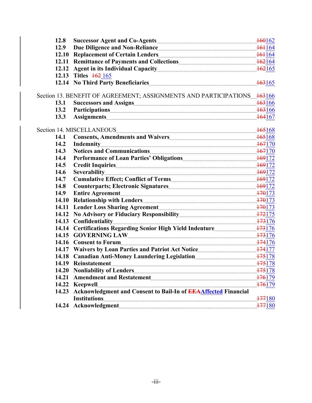 -iii- 12.8 Successor Agent and Co-Agents 160162 12.9 Due Diligence and Non-Reliance 161164 12.10 Replacement of Certain Lenders 161164 12.11 Remittance of Payments and Collections 162164 12.12 Agent in its Individual Capacity 162165 12.13 Titles 162 165 12.14 No Third Party Beneficiaries 163165 Section 13. BENEFIT OF AGREEMENT; ASSIGNMENTS AND PARTICIPATIONS 163166 13.1 Successors and Assigns 163166 13.2 Participations 163166 13.3 Assignments 164167 Section 14. MISCELLANEOUS 165168 14.1 Consents, Amendments and Waivers 165168 14.2 Indemnity 167170 14.3 Notices and Communications 167170 14.4 Performance of Loan Parties’ Obligations 169172 14.5 Credit Inquiries 169172 14.6 Severability 169172 14.7 Cumulative Effect; Conflict of Terms 169172 14.8 Counterparts; Electronic Signatures 169172 14.9 Entire Agreement 170173 14.10 Relationship with Lenders 170173 14.11 Lender Loss Sharing Agreement 170173 14.12 No Advisory or Fiduciary Responsibility 172175 14.13 Confidentiality 173176 14.14 Certifications Regarding Senior High Yield Indenture 173176 14.15 GOVERNING LAW 173176 14.16 Consent to Forum 174176 14.17 Waivers by Loan Parties and Patriot Act Notice 174177 14.18 Canadian Anti-Money Laundering Legislation 175178 14.19 Reinstatement 175178 14.20 Nonliability of Lenders 175178 14.21 Amendment and Restatement 176179 14.22 Keepwell 176179 14.23 Acknowledgment and Consent to Bail-In of EEAAffected Financial Institutions 177180 14.24 Acknowledgment 177180