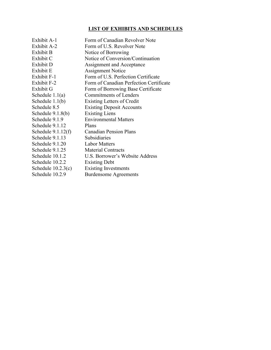 Existing Deposit Accounts Exhibit A-1 Schedule 9.1.8(b) Existing Liens Exhibit F-1 Schedule 9.1.9 Form of U.S. Perfection Certificate Environmental Matters Exhibit B Schedule 9.1.12 Form of Canadian Revolver Note Plans Exhibit F-2 Notice of Borrowing Schedule 9.1.12(f) Form of Canadian Perfection Certificate Canadian Pension Plans LIST OF EXHIBITS AND SCHEDULES Schedule 9.1.13 Subsidiaries Exhibit G Schedule 9.1.20 Form of Borrowing Base Certificate Labor Matters Exhibit C Exhibit D Schedule 9.1.25 Material Contracts Schedule 1.1(a) Notice of Conversion/Continuation Assignment and Acceptance Schedule 10.1.2 Commitments of Lenders U.S. Borrower’s Website Address Exhibit A-2 Schedule 10.2.2 Existing Debt Schedule 1.1(b) Schedule 10.2.3(c) Existing Letters of Credit Existing Investments Exhibit E Schedule 10.2.9 Form of U.S. Revolver Note Burdensome Agreements Schedule 8.5 Assignment Notice