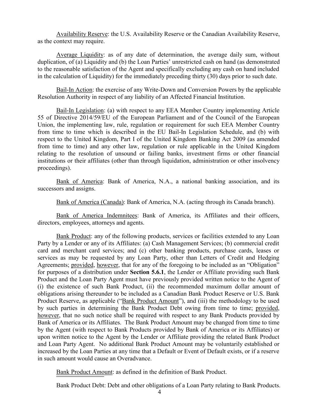 Availability Reserve: the U.S. Availability Reserve or the Canadian Availability Reserve, as the context may require. Average Liquidity: as of any date of determination, the average daily sum, without duplication, of (a) Liquidity and (b) the Loan Parties’ unrestricted cash on hand (as demonstrated to the reasonable satisfaction of the Agent and specifically excluding any cash on hand included in the calculation of Liquidity) for the immediately preceding thirty (30) days prior to such date. Bail-In Action: the exercise of any Write-Down and Conversion Powers by the applicable Resolution Authority in respect of any liability of an Affected Financial Institution. Bail-In Legislation: (a) with respect to any EEA Member Country implementing Article 55 of Directive 2014/59/EU of the European Parliament and of the Council of the European Union, the implementing law, rule, regulation or requirement for such EEA Member Country from time to time which is described in the EU Bail-In Legislation Schedule, and (b) with respect to the United Kingdom, Part I of the United Kingdom Banking Act 2009 (as amended from time to time) and any other law, regulation or rule applicable in the United Kingdom relating to the resolution of unsound or failing banks, investment firms or other financial institutions or their affiliates (other than through liquidation, administration or other insolvency proceedings). Bank of America: Bank of America, N.A., a national banking association, and its successors and assigns. Bank of America (Canada): Bank of America, N.A. (acting through its Canada branch). Bank of America Indemnitees: Bank of America, its Affiliates and their officers, directors, employees, attorneys and agents. Bank Product: any of the following products, services or facilities extended to any Loan Party by a Lender or any of its Affiliates: (a) Cash Management Services; (b) commercial credit card and merchant card services; and (c) other banking products, purchase cards, leases or services as may be requested by any Loan Party, other than Letters of Credit and Hedging Agreements; provided, however, that for any of the foregoing to be included as an “Obligation” for purposes of a distribution under Section 5.6.1, the Lender or Affiliate providing such Bank Product and the Loan Party Agent must have previously provided written notice to the Agent of (i) the existence of such Bank Product, (ii) the recommended maximum dollar amount of obligations arising thereunder to be included as a Canadian Bank Product Reserve or U.S. Bank Product Reserve, as applicable (“Bank Product Amount”), and (iii) the methodology to be used by such parties in determining the Bank Product Debt owing from time to time; provided, however, that no such notice shall be required with respect to any Bank Products provided by Bank of America or its Affiliates. The Bank Product Amount may be changed from time to time by the Agent (with respect to Bank Products provided by Bank of America or its Affiliates) or upon written notice to the Agent by the Lender or Affiliate providing the related Bank Product and Loan Party Agent. No additional Bank Product Amount may be voluntarily established or increased by the Loan Parties at any time that a Default or Event of Default exists, or if a reserve in such amount would cause an Overadvance. Bank Product Amount: as defined in the definition of Bank Product. Bank Product Debt: Debt and other obligations of a Loan Party relating to Bank Products. 4