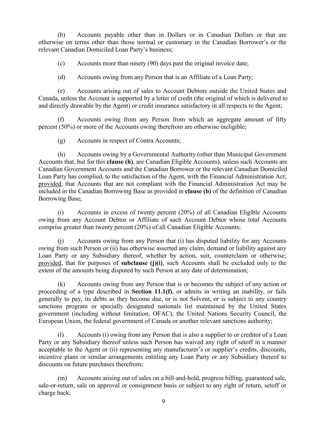 (b) Accounts payable other than in Dollars or in Canadian Dollars or that are otherwise on terms other than those normal or customary in the Canadian Borrower’s or the relevant Canadian Domiciled Loan Party’s business; (c) Accounts more than ninety (90) days past the original invoice date; (d) Accounts owing from any Person that is an Affiliate of a Loan Party; (e) Accounts arising out of sales to Account Debtors outside the United States and Canada, unless the Account is supported by a letter of credit (the original of which is delivered to and directly drawable by the Agent) or credit insurance satisfactory in all respects to the Agent; (f) Accounts owing from any Person from which an aggregate amount of fifty percent (50%) or more of the Accounts owing therefrom are otherwise ineligible; (g) Accounts in respect of Contra Accounts; (h) Accounts owing by a Governmental Authority (other than Municipal Government Accounts that, but for this clause (h), are Canadian Eligible Accounts), unless such Accounts are Canadian Government Accounts and the Canadian Borrower or the relevant Canadian Domiciled Loan Party has complied, to the satisfaction of the Agent, with the Financial Administration Act; provided, that Accounts that are not compliant with the Financial Administration Act may be included in the Canadian Borrowing Base as provided in clause (b) of the definition of Canadian Borrowing Base; (i) Accounts in excess of twenty percent (20%) of all Canadian Eligible Accounts owing from any Account Debtor or Affiliate of such Account Debtor whose total Accounts comprise greater than twenty percent (20%) of all Canadian Eligible Accounts; (j) Accounts owing from any Person that (i) has disputed liability for any Accounts owing from such Person or (ii) has otherwise asserted any claim, demand or liability against any Loan Party or any Subsidiary thereof, whether by action, suit, counterclaim or otherwise; provided, that for purposes of subclause (j)(i), such Accounts shall be excluded only to the extent of the amounts being disputed by such Person at any date of determination; (k) Accounts owing from any Person that is or becomes the subject of any action or proceeding of a type described in Section 11.1(f), or admits in writing an inability, or fails generally to pay, its debts as they become due, or is not Solvent, or is subject to any country sanctions program or specially designated nationals list maintained by the United States government (including without limitation, OFAC), the United Nations Security Council, the European Union, the federal government of Canada or another relevant sanctions authority; (l) Accounts (i) owing from any Person that is also a supplier to or creditor of a Loan Party or any Subsidiary thereof unless such Person has waived any right of setoff in a manner acceptable to the Agent or (ii) representing any manufacturer’s or supplier’s credits, discounts, incentive plans or similar arrangements entitling any Loan Party or any Subsidiary thereof to discounts on future purchases therefrom; (m) Accounts arising out of sales on a bill-and-hold, progress billing, guaranteed sale, sale-or-return, sale on approval or consignment basis or subject to any right of return, setoff or charge back; 9