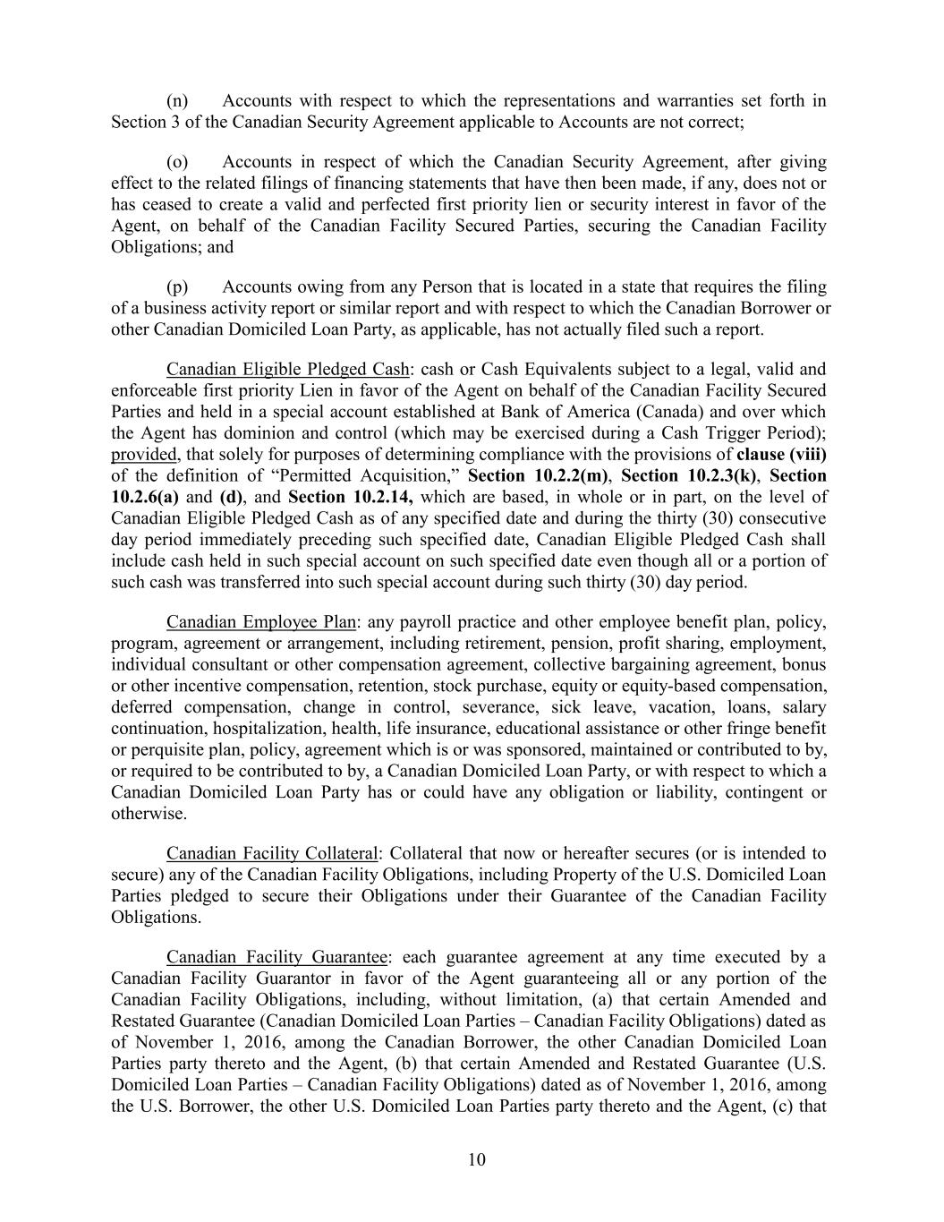 (n) Accounts with respect to which the representations and warranties set forth in Section 3 of the Canadian Security Agreement applicable to Accounts are not correct; (o) Accounts in respect of which the Canadian Security Agreement, after giving effect to the related filings of financing statements that have then been made, if any, does not or has ceased to create a valid and perfected first priority lien or security interest in favor of the Agent, on behalf of the Canadian Facility Secured Parties, securing the Canadian Facility Obligations; and (p) Accounts owing from any Person that is located in a state that requires the filing of a business activity report or similar report and with respect to which the Canadian Borrower or other Canadian Domiciled Loan Party, as applicable, has not actually filed such a report. Canadian Eligible Pledged Cash: cash or Cash Equivalents subject to a legal, valid and enforceable first priority Lien in favor of the Agent on behalf of the Canadian Facility Secured Parties and held in a special account established at Bank of America (Canada) and over which the Agent has dominion and control (which may be exercised during a Cash Trigger Period); provided, that solely for purposes of determining compliance with the provisions of clause (viii) of the definition of “Permitted Acquisition,” Section 10.2.2(m), Section 10.2.3(k), Section 10.2.6(a) and (d), and Section 10.2.14, which are based, in whole or in part, on the level of Canadian Eligible Pledged Cash as of any specified date and during the thirty (30) consecutive day period immediately preceding such specified date, Canadian Eligible Pledged Cash shall include cash held in such special account on such specified date even though all or a portion of such cash was transferred into such special account during such thirty (30) day period. Canadian Employee Plan: any payroll practice and other employee benefit plan, policy, program, agreement or arrangement, including retirement, pension, profit sharing, employment, individual consultant or other compensation agreement, collective bargaining agreement, bonus or other incentive compensation, retention, stock purchase, equity or equity-based compensation, deferred compensation, change in control, severance, sick leave, vacation, loans, salary continuation, hospitalization, health, life insurance, educational assistance or other fringe benefit or perquisite plan, policy, agreement which is or was sponsored, maintained or contributed to by, or required to be contributed to by, a Canadian Domiciled Loan Party, or with respect to which a Canadian Domiciled Loan Party has or could have any obligation or liability, contingent or otherwise. Canadian Facility Collateral: Collateral that now or hereafter secures (or is intended to secure) any of the Canadian Facility Obligations, including Property of the U.S. Domiciled Loan Parties pledged to secure their Obligations under their Guarantee of the Canadian Facility Obligations. Canadian Facility Guarantee: each guarantee agreement at any time executed by a Canadian Facility Guarantor in favor of the Agent guaranteeing all or any portion of the Canadian Facility Obligations, including, without limitation, (a) that certain Amended and Restated Guarantee (Canadian Domiciled Loan Parties – Canadian Facility Obligations) dated as of November 1, 2016, among the Canadian Borrower, the other Canadian Domiciled Loan Parties party thereto and the Agent, (b) that certain Amended and Restated Guarantee (U.S. Domiciled Loan Parties – Canadian Facility Obligations) dated as of November 1, 2016, among the U.S. Borrower, the other U.S. Domiciled Loan Parties party thereto and the Agent, (c) that 10