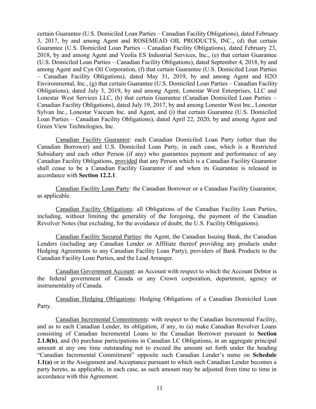 certain Guarantee (U.S. Domiciled Loan Parties – Canadian Facility Obligations), dated February 3, 2017, by and among Agent and ROSEMEAD OIL PRODUCTS, INC., (d) that certain Guarantee (U.S. Domiciled Loan Parties – Canadian Facility Obligations), dated February 23, 2018, by and among Agent and Veolia ES Industrial Services, Inc., (e) that certain Guarantee (U.S. Domiciled Loan Parties – Canadian Facility Obligations), dated September 4, 2018, by and among Agent and Cyn Oil Corporation, (f) that certain Guarantee (U.S. Domiciled Loan Parties – Canadian Facility Obligations), dated May 31, 2019, by and among Agent and H2O Environmental, Inc., (g) that certain Guarantee (U.S. Domiciled Loan Parties – Canadian Facility Obligations), dated July 3, 2019, by and among Agent, Lonestar West Enterprises, LLC and Lonestar West Services LLC, (h) that certain Guarantee (Canadian Domiciled Loan Parties – Canadian Facility Obligations), dated July 19, 2017, by and among Lonestar West Inc., Lonestar Sylvan Inc., Lonestar Vaccum Inc. and Agent, and (i) that certain Guarantee (U.S. Domiciled Loan Parties – Canadian Facility Obligations), dated April 22, 2020, by and among Agent and Green View Technologies, Inc. Canadian Facility Guarantor: each Canadian Domiciled Loan Party (other than the Canadian Borrower) and U.S. Domiciled Loan Party, in each case, which is a Restricted Subsidiary and each other Person (if any) who guarantees payment and performance of any Canadian Facility Obligations, provided that any Person which is a Canadian Facility Guarantor shall cease to be a Canadian Facility Guarantor if and when its Guarantee is released in accordance with Section 12.2.1. Canadian Facility Loan Party: the Canadian Borrower or a Canadian Facility Guarantor, as applicable. Canadian Facility Obligations: all Obligations of the Canadian Facility Loan Parties, including, without limiting the generality of the foregoing, the payment of the Canadian Revolver Notes (but excluding, for the avoidance of doubt, the U.S. Facility Obligations). Canadian Facility Secured Parties: the Agent, the Canadian Issuing Bank, the Canadian Lenders (including any Canadian Lender or Affiliate thereof providing any products under Hedging Agreements to any Canadian Facility Loan Party), providers of Bank Products to the Canadian Facility Loan Parties, and the Lead Arranger. Canadian Government Account: an Account with respect to which the Account Debtor is the federal government of Canada or any Crown corporation, department, agency or instrumentality of Canada. Canadian Hedging Obligations: Hedging Obligations of a Canadian Domiciled Loan Party. Canadian Incremental Commitments: with respect to the Canadian Incremental Facility, and as to each Canadian Lender, its obligation, if any, to (a) make Canadian Revolver Loans consisting of Canadian Incremental Loans to the Canadian Borrower pursuant to Section 2.1.8(b), and (b) purchase participations in Canadian LC Obligations, in an aggregate principal amount at any one time outstanding not to exceed the amount set forth under the heading “Canadian Incremental Commitment” opposite such Canadian Lender’s name on Schedule 1.1(a) or in the Assignment and Acceptance pursuant to which such Canadian Lender becomes a party hereto, as applicable, in each case, as such amount may be adjusted from time to time in accordance with this Agreement. 11