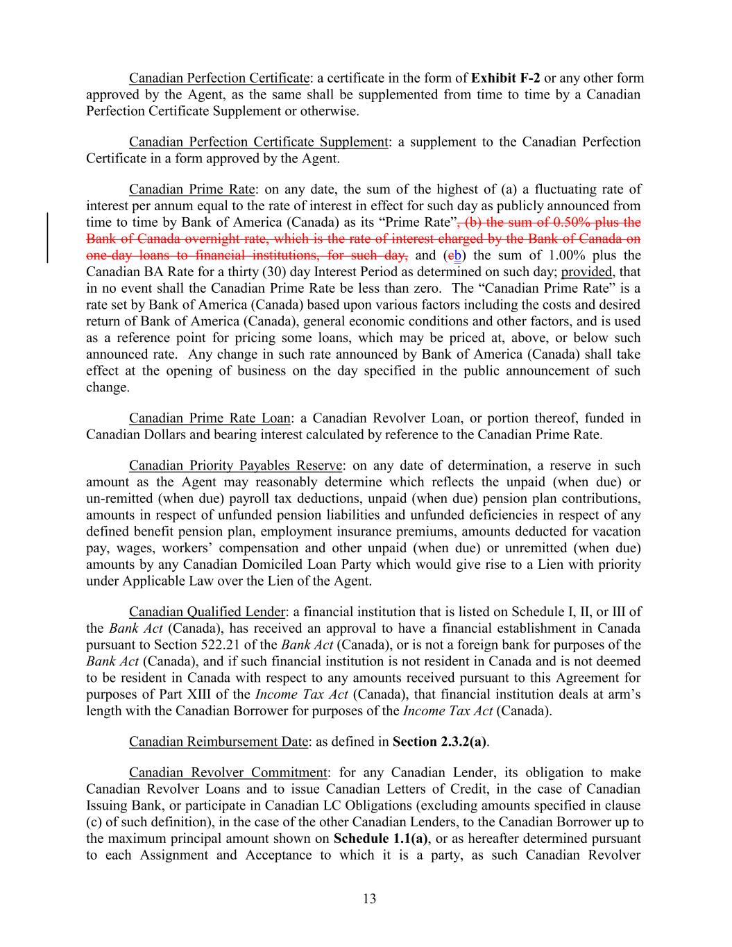 Canadian Perfection Certificate: a certificate in the form of Exhibit F-2 or any other form approved by the Agent, as the same shall be supplemented from time to time by a Canadian Perfection Certificate Supplement or otherwise. Canadian Perfection Certificate Supplement: a supplement to the Canadian Perfection Certificate in a form approved by the Agent. Canadian Prime Rate: on any date, the sum of the highest of (a) a fluctuating rate of interest per annum equal to the rate of interest in effect for such day as publicly announced from time to time by Bank of America (Canada) as its “Prime Rate”, (b) the sum of 0.50% plus the Bank of Canada overnight rate, which is the rate of interest charged by the Bank of Canada on one-day loans to financial institutions, for such day, and (cb) the sum of 1.00% plus the Canadian BA Rate for a thirty (30) day Interest Period as determined on such day; provided, that in no event shall the Canadian Prime Rate be less than zero. The “Canadian Prime Rate” is a rate set by Bank of America (Canada) based upon various factors including the costs and desired return of Bank of America (Canada), general economic conditions and other factors, and is used as a reference point for pricing some loans, which may be priced at, above, or below such announced rate. Any change in such rate announced by Bank of America (Canada) shall take effect at the opening of business on the day specified in the public announcement of such change. Canadian Prime Rate Loan: a Canadian Revolver Loan, or portion thereof, funded in Canadian Dollars and bearing interest calculated by reference to the Canadian Prime Rate. Canadian Priority Payables Reserve: on any date of determination, a reserve in such amount as the Agent may reasonably determine which reflects the unpaid (when due) or un-remitted (when due) payroll tax deductions, unpaid (when due) pension plan contributions, amounts in respect of unfunded pension liabilities and unfunded deficiencies in respect of any defined benefit pension plan, employment insurance premiums, amounts deducted for vacation pay, wages, workers’ compensation and other unpaid (when due) or unremitted (when due) amounts by any Canadian Domiciled Loan Party which would give rise to a Lien with priority under Applicable Law over the Lien of the Agent. Canadian Qualified Lender: a financial institution that is listed on Schedule I, II, or III of the Bank Act (Canada), has received an approval to have a financial establishment in Canada pursuant to Section 522.21 of the Bank Act (Canada), or is not a foreign bank for purposes of the Bank Act (Canada), and if such financial institution is not resident in Canada and is not deemed to be resident in Canada with respect to any amounts received pursuant to this Agreement for purposes of Part XIII of the Income Tax Act (Canada), that financial institution deals at arm’s length with the Canadian Borrower for purposes of the Income Tax Act (Canada). Canadian Reimbursement Date: as defined in Section 2.3.2(a). Canadian Revolver Commitment: for any Canadian Lender, its obligation to make Canadian Revolver Loans and to issue Canadian Letters of Credit, in the case of Canadian Issuing Bank, or participate in Canadian LC Obligations (excluding amounts specified in clause (c) of such definition), in the case of the other Canadian Lenders, to the Canadian Borrower up to the maximum principal amount shown on Schedule 1.1(a), or as hereafter determined pursuant to each Assignment and Acceptance to which it is a party, as such Canadian Revolver 13