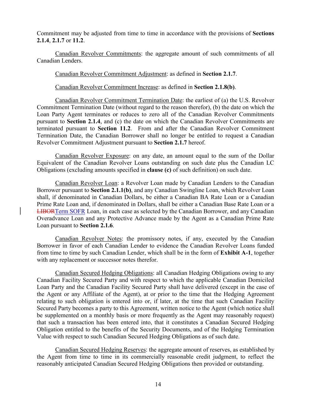 Commitment may be adjusted from time to time in accordance with the provisions of Sections 2.1.4, 2.1.7 or 11.2. Canadian Revolver Commitments: the aggregate amount of such commitments of all Canadian Lenders. Canadian Revolver Commitment Adjustment: as defined in Section 2.1.7. Canadian Revolver Commitment Increase: as defined in Section 2.1.8(b). Canadian Revolver Commitment Termination Date: the earliest of (a) the U.S. Revolver Commitment Termination Date (without regard to the reason therefor), (b) the date on which the Loan Party Agent terminates or reduces to zero all of the Canadian Revolver Commitments pursuant to Section 2.1.4, and (c) the date on which the Canadian Revolver Commitments are terminated pursuant to Section 11.2. From and after the Canadian Revolver Commitment Termination Date, the Canadian Borrower shall no longer be entitled to request a Canadian Revolver Commitment Adjustment pursuant to Section 2.1.7 hereof. Canadian Revolver Exposure: on any date, an amount equal to the sum of the Dollar Equivalent of the Canadian Revolver Loans outstanding on such date plus the Canadian LC Obligations (excluding amounts specified in clause (c) of such definition) on such date. Canadian Revolver Loan: a Revolver Loan made by Canadian Lenders to the Canadian Borrower pursuant to Section 2.1.1(b), and any Canadian Swingline Loan, which Revolver Loan shall, if denominated in Canadian Dollars, be either a Canadian BA Rate Loan or a Canadian Prime Rate Loan and, if denominated in Dollars, shall be either a Canadian Base Rate Loan or a LIBORTerm SOFR Loan, in each case as selected by the Canadian Borrower, and any Canadian Overadvance Loan and any Protective Advance made by the Agent as a Canadian Prime Rate Loan pursuant to Section 2.1.6. Canadian Revolver Notes: the promissory notes, if any, executed by the Canadian Borrower in favor of each Canadian Lender to evidence the Canadian Revolver Loans funded from time to time by such Canadian Lender, which shall be in the form of Exhibit A-1, together with any replacement or successor notes therefor. Canadian Secured Hedging Obligations: all Canadian Hedging Obligations owing to any Canadian Facility Secured Party and with respect to which the applicable Canadian Domiciled Loan Party and the Canadian Facility Secured Party shall have delivered (except in the case of the Agent or any Affiliate of the Agent), at or prior to the time that the Hedging Agreement relating to such obligation is entered into or, if later, at the time that such Canadian Facility Secured Party becomes a party to this Agreement, written notice to the Agent (which notice shall be supplemented on a monthly basis or more frequently as the Agent may reasonably request) that such a transaction has been entered into, that it constitutes a Canadian Secured Hedging Obligation entitled to the benefits of the Security Documents, and of the Hedging Termination Value with respect to such Canadian Secured Hedging Obligations as of such date. Canadian Secured Hedging Reserves: the aggregate amount of reserves, as established by the Agent from time to time in its commercially reasonable credit judgment, to reflect the reasonably anticipated Canadian Secured Hedging Obligations then provided or outstanding. 14