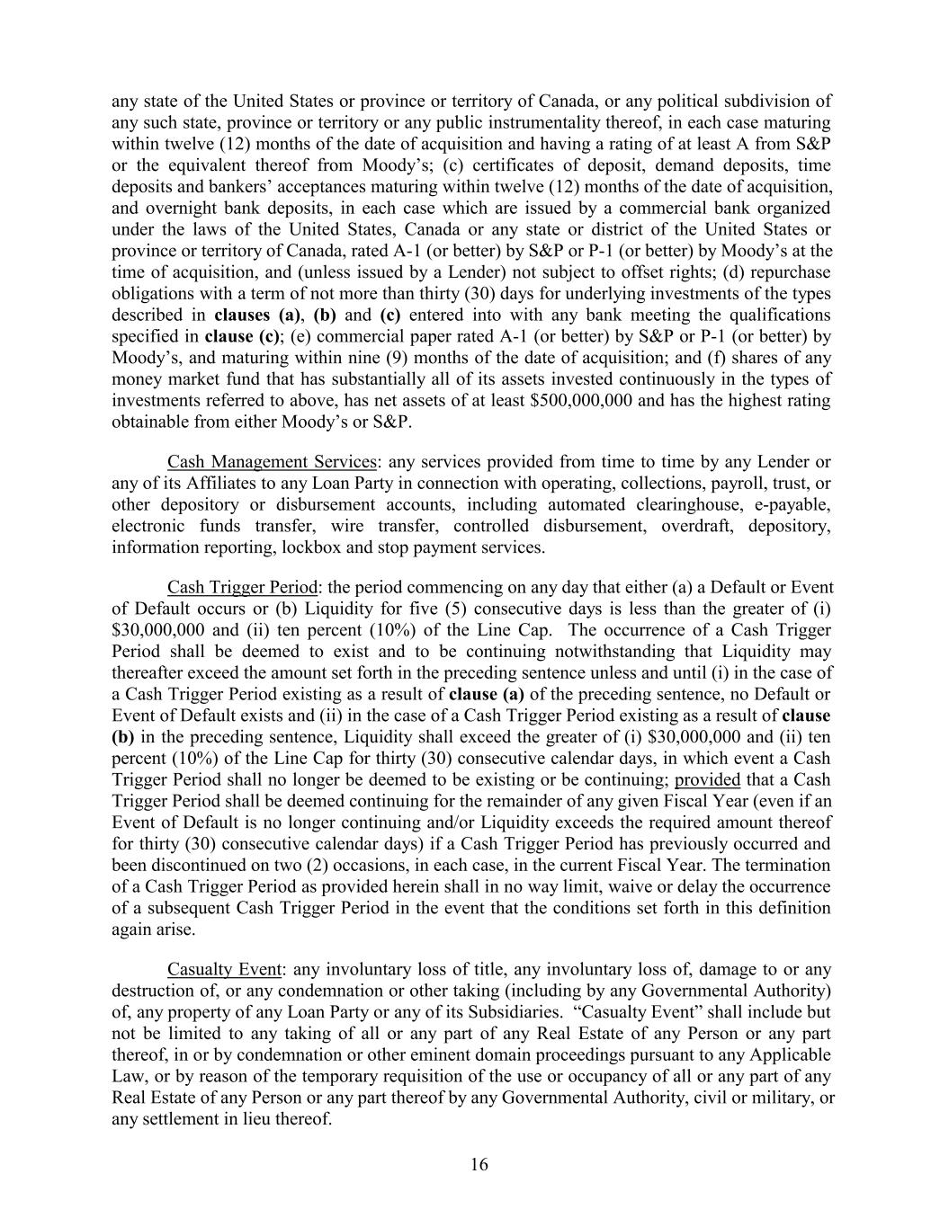 any state of the United States or province or territory of Canada, or any political subdivision of any such state, province or territory or any public instrumentality thereof, in each case maturing within twelve (12) months of the date of acquisition and having a rating of at least A from S&P or the equivalent thereof from Moody’s; (c) certificates of deposit, demand deposits, time deposits and bankers’ acceptances maturing within twelve (12) months of the date of acquisition, and overnight bank deposits, in each case which are issued by a commercial bank organized under the laws of the United States, Canada or any state or district of the United States or province or territory of Canada, rated A-1 (or better) by S&P or P-1 (or better) by Moody’s at the time of acquisition, and (unless issued by a Lender) not subject to offset rights; (d) repurchase obligations with a term of not more than thirty (30) days for underlying investments of the types described in clauses (a), (b) and (c) entered into with any bank meeting the qualifications specified in clause (c); (e) commercial paper rated A-1 (or better) by S&P or P-1 (or better) by Moody’s, and maturing within nine (9) months of the date of acquisition; and (f) shares of any money market fund that has substantially all of its assets invested continuously in the types of investments referred to above, has net assets of at least $500,000,000 and has the highest rating obtainable from either Moody’s or S&P. Cash Management Services: any services provided from time to time by any Lender or any of its Affiliates to any Loan Party in connection with operating, collections, payroll, trust, or other depository or disbursement accounts, including automated clearinghouse, e-payable, electronic funds transfer, wire transfer, controlled disbursement, overdraft, depository, information reporting, lockbox and stop payment services. Cash Trigger Period: the period commencing on any day that either (a) a Default or Event of Default occurs or (b) Liquidity for five (5) consecutive days is less than the greater of (i) $30,000,000 and (ii) ten percent (10%) of the Line Cap. The occurrence of a Cash Trigger Period shall be deemed to exist and to be continuing notwithstanding that Liquidity may thereafter exceed the amount set forth in the preceding sentence unless and until (i) in the case of a Cash Trigger Period existing as a result of clause (a) of the preceding sentence, no Default or Event of Default exists and (ii) in the case of a Cash Trigger Period existing as a result of clause (b) in the preceding sentence, Liquidity shall exceed the greater of (i) $30,000,000 and (ii) ten percent (10%) of the Line Cap for thirty (30) consecutive calendar days, in which event a Cash Trigger Period shall no longer be deemed to be existing or be continuing; provided that a Cash Trigger Period shall be deemed continuing for the remainder of any given Fiscal Year (even if an Event of Default is no longer continuing and/or Liquidity exceeds the required amount thereof for thirty (30) consecutive calendar days) if a Cash Trigger Period has previously occurred and been discontinued on two (2) occasions, in each case, in the current Fiscal Year. The termination of a Cash Trigger Period as provided herein shall in no way limit, waive or delay the occurrence of a subsequent Cash Trigger Period in the event that the conditions set forth in this definition again arise. Casualty Event: any involuntary loss of title, any involuntary loss of, damage to or any destruction of, or any condemnation or other taking (including by any Governmental Authority) of, any property of any Loan Party or any of its Subsidiaries. “Casualty Event” shall include but not be limited to any taking of all or any part of any Real Estate of any Person or any part thereof, in or by condemnation or other eminent domain proceedings pursuant to any Applicable Law, or by reason of the temporary requisition of the use or occupancy of all or any part of any Real Estate of any Person or any part thereof by any Governmental Authority, civil or military, or any settlement in lieu thereof. 16