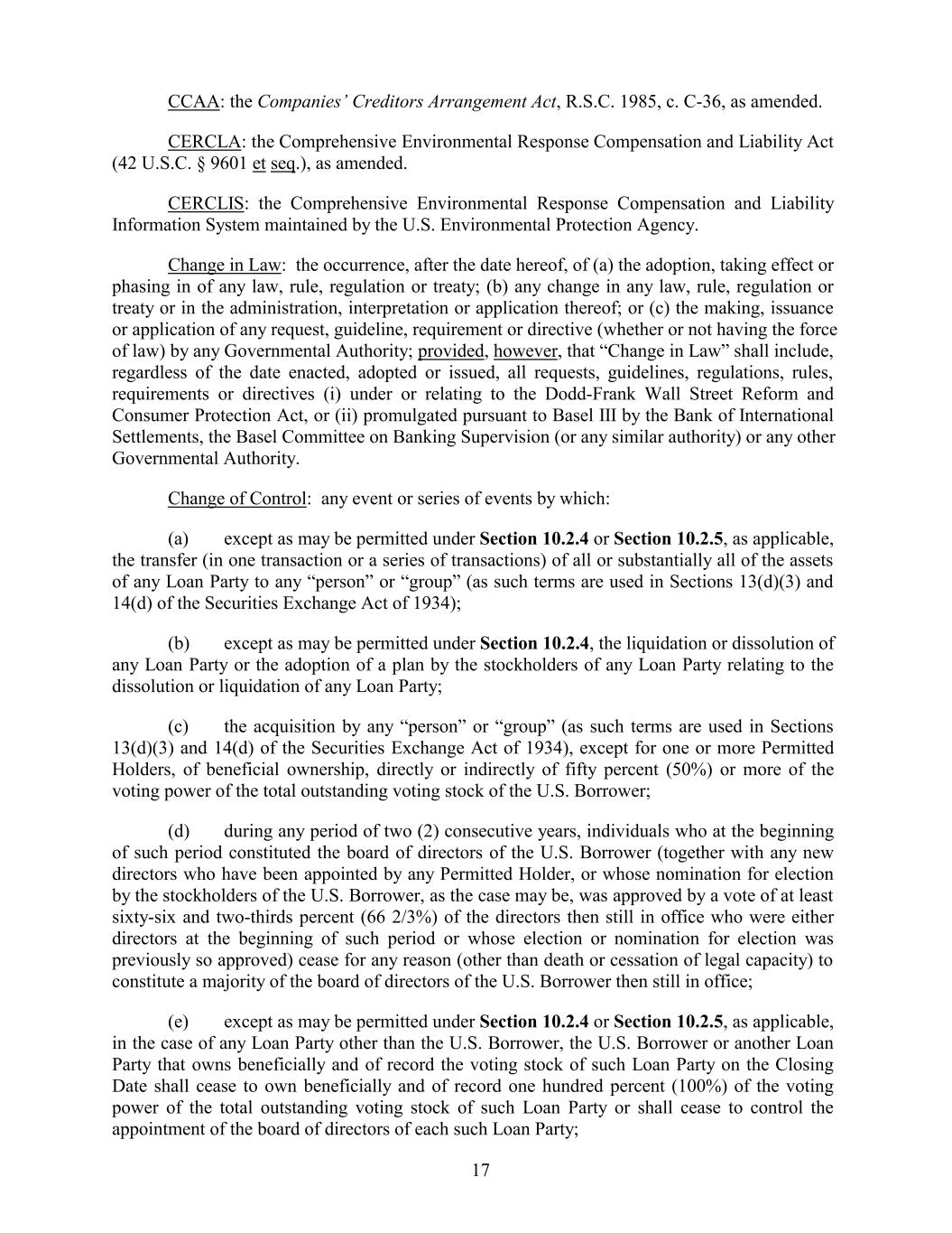 CCAA: the Companies’ Creditors Arrangement Act, R.S.C. 1985, c. C-36, as amended. CERCLA: the Comprehensive Environmental Response Compensation and Liability Act (42 U.S.C. § 9601 et seq.), as amended. CERCLIS: the Comprehensive Environmental Response Compensation and Liability Information System maintained by the U.S. Environmental Protection Agency. Change in Law: the occurrence, after the date hereof, of (a) the adoption, taking effect or phasing in of any law, rule, regulation or treaty; (b) any change in any law, rule, regulation or treaty or in the administration, interpretation or application thereof; or (c) the making, issuance or application of any request, guideline, requirement or directive (whether or not having the force of law) by any Governmental Authority; provided, however, that “Change in Law” shall include, regardless of the date enacted, adopted or issued, all requests, guidelines, regulations, rules, requirements or directives (i) under or relating to the Dodd-Frank Wall Street Reform and Consumer Protection Act, or (ii) promulgated pursuant to Basel III by the Bank of International Settlements, the Basel Committee on Banking Supervision (or any similar authority) or any other Governmental Authority. Change of Control: any event or series of events by which: (a) except as may be permitted under Section 10.2.4 or Section 10.2.5, as applicable, the transfer (in one transaction or a series of transactions) of all or substantially all of the assets of any Loan Party to any “person” or “group” (as such terms are used in Sections 13(d)(3) and 14(d) of the Securities Exchange Act of 1934); (b) except as may be permitted under Section 10.2.4, the liquidation or dissolution of any Loan Party or the adoption of a plan by the stockholders of any Loan Party relating to the dissolution or liquidation of any Loan Party; (c) the acquisition by any “person” or “group” (as such terms are used in Sections 13(d)(3) and 14(d) of the Securities Exchange Act of 1934), except for one or more Permitted Holders, of beneficial ownership, directly or indirectly of fifty percent (50%) or more of the voting power of the total outstanding voting stock of the U.S. Borrower; (d) during any period of two (2) consecutive years, individuals who at the beginning of such period constituted the board of directors of the U.S. Borrower (together with any new directors who have been appointed by any Permitted Holder, or whose nomination for election by the stockholders of the U.S. Borrower, as the case may be, was approved by a vote of at least sixty-six and two-thirds percent (66 2/3%) of the directors then still in office who were either directors at the beginning of such period or whose election or nomination for election was previously so approved) cease for any reason (other than death or cessation of legal capacity) to constitute a majority of the board of directors of the U.S. Borrower then still in office; (e) except as may be permitted under Section 10.2.4 or Section 10.2.5, as applicable, in the case of any Loan Party other than the U.S. Borrower, the U.S. Borrower or another Loan Party that owns beneficially and of record the voting stock of such Loan Party on the Closing Date shall cease to own beneficially and of record one hundred percent (100%) of the voting power of the total outstanding voting stock of such Loan Party or shall cease to control the appointment of the board of directors of each such Loan Party; 17