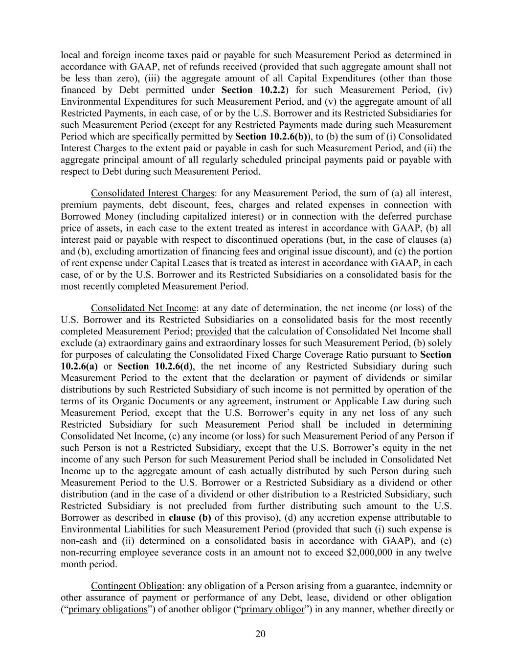 local and foreign income taxes paid or payable for such Measurement Period as determined in accordance with GAAP, net of refunds received (provided that such aggregate amount shall not be less than zero), (iii) the aggregate amount of all Capital Expenditures (other than those financed by Debt permitted under Section 10.2.2) for such Measurement Period, (iv) Environmental Expenditures for such Measurement Period, and (v) the aggregate amount of all Restricted Payments, in each case, of or by the U.S. Borrower and its Restricted Subsidiaries for such Measurement Period (except for any Restricted Payments made during such Measurement Period which are specifically permitted by Section 10.2.6(b)), to (b) the sum of (i) Consolidated Interest Charges to the extent paid or payable in cash for such Measurement Period, and (ii) the aggregate principal amount of all regularly scheduled principal payments paid or payable with respect to Debt during such Measurement Period. Consolidated Interest Charges: for any Measurement Period, the sum of (a) all interest, premium payments, debt discount, fees, charges and related expenses in connection with Borrowed Money (including capitalized interest) or in connection with the deferred purchase price of assets, in each case to the extent treated as interest in accordance with GAAP, (b) all interest paid or payable with respect to discontinued operations (but, in the case of clauses (a) and (b), excluding amortization of financing fees and original issue discount), and (c) the portion of rent expense under Capital Leases that is treated as interest in accordance with GAAP, in each case, of or by the U.S. Borrower and its Restricted Subsidiaries on a consolidated basis for the most recently completed Measurement Period. Consolidated Net Income: at any date of determination, the net income (or loss) of the U.S. Borrower and its Restricted Subsidiaries on a consolidated basis for the most recently completed Measurement Period; provided that the calculation of Consolidated Net Income shall exclude (a) extraordinary gains and extraordinary losses for such Measurement Period, (b) solely for purposes of calculating the Consolidated Fixed Charge Coverage Ratio pursuant to Section 10.2.6(a) or Section 10.2.6(d), the net income of any Restricted Subsidiary during such Measurement Period to the extent that the declaration or payment of dividends or similar distributions by such Restricted Subsidiary of such income is not permitted by operation of the terms of its Organic Documents or any agreement, instrument or Applicable Law during such Measurement Period, except that the U.S. Borrower’s equity in any net loss of any such Restricted Subsidiary for such Measurement Period shall be included in determining Consolidated Net Income, (c) any income (or loss) for such Measurement Period of any Person if such Person is not a Restricted Subsidiary, except that the U.S. Borrower’s equity in the net income of any such Person for such Measurement Period shall be included in Consolidated Net Income up to the aggregate amount of cash actually distributed by such Person during such Measurement Period to the U.S. Borrower or a Restricted Subsidiary as a dividend or other distribution (and in the case of a dividend or other distribution to a Restricted Subsidiary, such Restricted Subsidiary is not precluded from further distributing such amount to the U.S. Borrower as described in clause (b) of this proviso), (d) any accretion expense attributable to Environmental Liabilities for such Measurement Period (provided that such (i) such expense is non-cash and (ii) determined on a consolidated basis in accordance with GAAP), and (e) non-recurring employee severance costs in an amount not to exceed $2,000,000 in any twelve month period. Contingent Obligation: any obligation of a Person arising from a guarantee, indemnity or other assurance of payment or performance of any Debt, lease, dividend or other obligation (“primary obligations”) of another obligor (“primary obligor”) in any manner, whether directly or 20