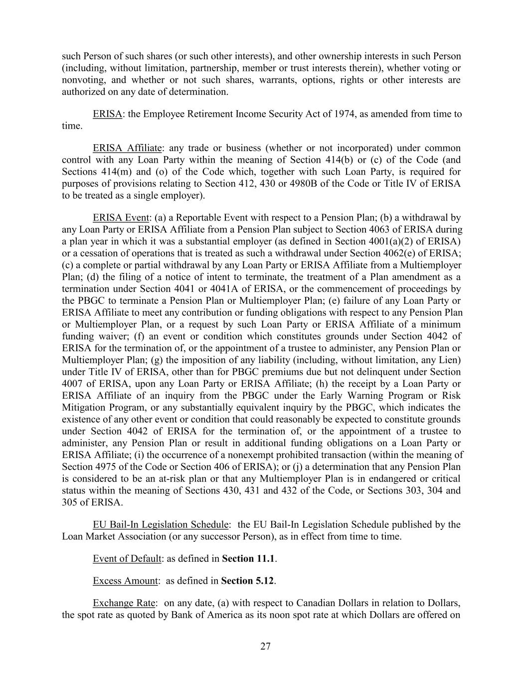 such Person of such shares (or such other interests), and other ownership interests in such Person (including, without limitation, partnership, member or trust interests therein), whether voting or nonvoting, and whether or not such shares, warrants, options, rights or other interests are authorized on any date of determination. ERISA: the Employee Retirement Income Security Act of 1974, as amended from time to time. ERISA Affiliate: any trade or business (whether or not incorporated) under common control with any Loan Party within the meaning of Section 414(b) or (c) of the Code (and Sections 414(m) and (o) of the Code which, together with such Loan Party, is required for purposes of provisions relating to Section 412, 430 or 4980B of the Code or Title IV of ERISA to be treated as a single employer). ERISA Event: (a) a Reportable Event with respect to a Pension Plan; (b) a withdrawal by any Loan Party or ERISA Affiliate from a Pension Plan subject to Section 4063 of ERISA during a plan year in which it was a substantial employer (as defined in Section 4001(a)(2) of ERISA) or a cessation of operations that is treated as such a withdrawal under Section 4062(e) of ERISA; (c) a complete or partial withdrawal by any Loan Party or ERISA Affiliate from a Multiemployer Plan; (d) the filing of a notice of intent to terminate, the treatment of a Plan amendment as a termination under Section 4041 or 4041A of ERISA, or the commencement of proceedings by the PBGC to terminate a Pension Plan or Multiemployer Plan; (e) failure of any Loan Party or ERISA Affiliate to meet any contribution or funding obligations with respect to any Pension Plan or Multiemployer Plan, or a request by such Loan Party or ERISA Affiliate of a minimum funding waiver; (f) an event or condition which constitutes grounds under Section 4042 of ERISA for the termination of, or the appointment of a trustee to administer, any Pension Plan or Multiemployer Plan; (g) the imposition of any liability (including, without limitation, any Lien) under Title IV of ERISA, other than for PBGC premiums due but not delinquent under Section 4007 of ERISA, upon any Loan Party or ERISA Affiliate; (h) the receipt by a Loan Party or ERISA Affiliate of an inquiry from the PBGC under the Early Warning Program or Risk Mitigation Program, or any substantially equivalent inquiry by the PBGC, which indicates the existence of any other event or condition that could reasonably be expected to constitute grounds under Section 4042 of ERISA for the termination of, or the appointment of a trustee to administer, any Pension Plan or result in additional funding obligations on a Loan Party or ERISA Affiliate; (i) the occurrence of a nonexempt prohibited transaction (within the meaning of Section 4975 of the Code or Section 406 of ERISA); or (j) a determination that any Pension Plan is considered to be an at-risk plan or that any Multiemployer Plan is in endangered or critical status within the meaning of Sections 430, 431 and 432 of the Code, or Sections 303, 304 and 305 of ERISA. EU Bail-In Legislation Schedule: the EU Bail-In Legislation Schedule published by the Loan Market Association (or any successor Person), as in effect from time to time. Event of Default: as defined in Section 11.1. Excess Amount: as defined in Section 5.12. Exchange Rate: on any date, (a) with respect to Canadian Dollars in relation to Dollars, the spot rate as quoted by Bank of America as its noon spot rate at which Dollars are offered on 27