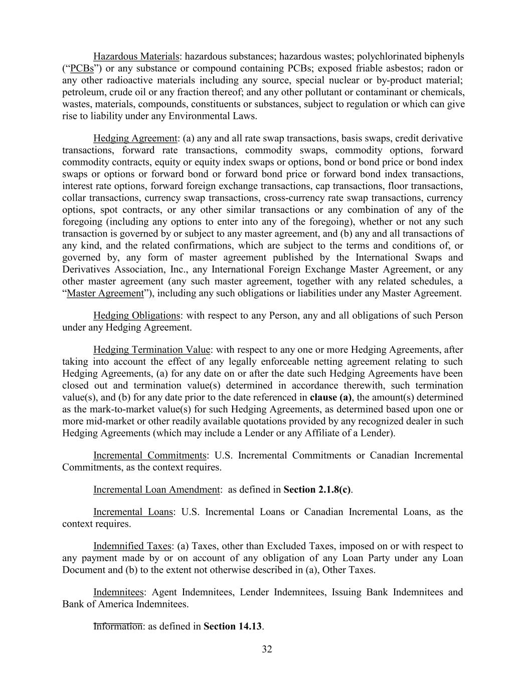 Hazardous Materials: hazardous substances; hazardous wastes; polychlorinated biphenyls (“PCBs”) or any substance or compound containing PCBs; exposed friable asbestos; radon or any other radioactive materials including any source, special nuclear or by-product material; petroleum, crude oil or any fraction thereof; and any other pollutant or contaminant or chemicals, wastes, materials, compounds, constituents or substances, subject to regulation or which can give rise to liability under any Environmental Laws. Hedging Agreement: (a) any and all rate swap transactions, basis swaps, credit derivative transactions, forward rate transactions, commodity swaps, commodity options, forward commodity contracts, equity or equity index swaps or options, bond or bond price or bond index swaps or options or forward bond or forward bond price or forward bond index transactions, interest rate options, forward foreign exchange transactions, cap transactions, floor transactions, collar transactions, currency swap transactions, cross-currency rate swap transactions, currency options, spot contracts, or any other similar transactions or any combination of any of the foregoing (including any options to enter into any of the foregoing), whether or not any such transaction is governed by or subject to any master agreement, and (b) any and all transactions of any kind, and the related confirmations, which are subject to the terms and conditions of, or governed by, any form of master agreement published by the International Swaps and Derivatives Association, Inc., any International Foreign Exchange Master Agreement, or any other master agreement (any such master agreement, together with any related schedules, a “Master Agreement”), including any such obligations or liabilities under any Master Agreement. Hedging Obligations: with respect to any Person, any and all obligations of such Person under any Hedging Agreement. Hedging Termination Value: with respect to any one or more Hedging Agreements, after taking into account the effect of any legally enforceable netting agreement relating to such Hedging Agreements, (a) for any date on or after the date such Hedging Agreements have been closed out and termination value(s) determined in accordance therewith, such termination value(s), and (b) for any date prior to the date referenced in clause (a), the amount(s) determined as the mark-to-market value(s) for such Hedging Agreements, as determined based upon one or more mid-market or other readily available quotations provided by any recognized dealer in such Hedging Agreements (which may include a Lender or any Affiliate of a Lender). Incremental Commitments: U.S. Incremental Commitments or Canadian Incremental Commitments, as the context requires. Incremental Loan Amendment: as defined in Section 2.1.8(c). Incremental Loans: U.S. Incremental Loans or Canadian Incremental Loans, as the context requires. Indemnified Taxes: (a) Taxes, other than Excluded Taxes, imposed on or with respect to any payment made by or on account of any obligation of any Loan Party under any Loan Document and (b) to the extent not otherwise described in (a), Other Taxes. Indemnitees: Agent Indemnitees, Lender Indemnitees, Issuing Bank Indemnitees and Bank of America Indemnitees. Information: as defined in Section 14.13. 32