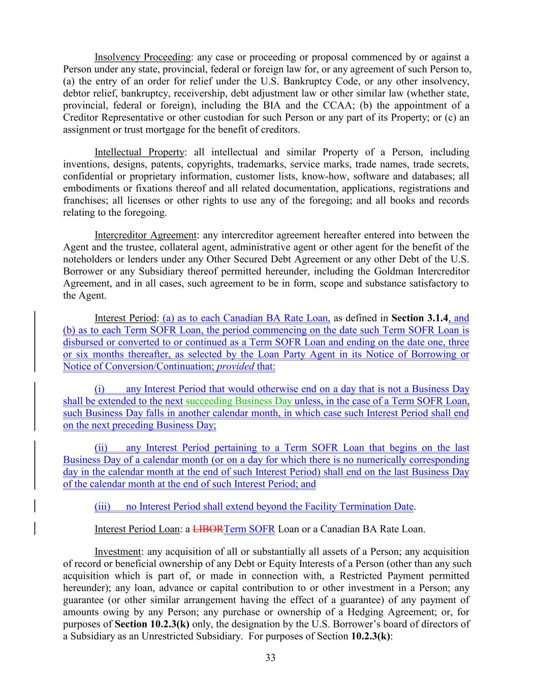Insolvency Proceeding: any case or proceeding or proposal commenced by or against a Person under any state, provincial, federal or foreign law for, or any agreement of such Person to, (a) the entry of an order for relief under the U.S. Bankruptcy Code, or any other insolvency, debtor relief, bankruptcy, receivership, debt adjustment law or other similar law (whether state, provincial, federal or foreign), including the BIA and the CCAA; (b) the appointment of a Creditor Representative or other custodian for such Person or any part of its Property; or (c) an assignment or trust mortgage for the benefit of creditors. Intellectual Property: all intellectual and similar Property of a Person, including inventions, designs, patents, copyrights, trademarks, service marks, trade names, trade secrets, confidential or proprietary information, customer lists, know-how, software and databases; all embodiments or fixations thereof and all related documentation, applications, registrations and franchises; all licenses or other rights to use any of the foregoing; and all books and records relating to the foregoing. Intercreditor Agreement: any intercreditor agreement hereafter entered into between the Agent and the trustee, collateral agent, administrative agent or other agent for the benefit of the noteholders or lenders under any Other Secured Debt Agreement or any other Debt of the U.S. Borrower or any Subsidiary thereof permitted hereunder, including the Goldman Intercreditor Agreement, and in all cases, such agreement to be in form, scope and substance satisfactory to the Agent. Interest Period: (a) as to each Canadian BA Rate Loan, as defined in Section 3.1.4, and (b) as to each Term SOFR Loan, the period commencing on the date such Term SOFR Loan is disbursed or converted to or continued as a Term SOFR Loan and ending on the date one, three or six months thereafter, as selected by the Loan Party Agent in its Notice of Borrowing or Notice of Conversion/Continuation; provided that: (i) any Interest Period that would otherwise end on a day that is not a Business Day shall be extended to the next succeeding Business Day unless, in the case of a Term SOFR Loan, such Business Day falls in another calendar month, in which case such Interest Period shall end on the next preceding Business Day; (ii) any Interest Period pertaining to a Term SOFR Loan that begins on the last Business Day of a calendar month (or on a day for which there is no numerically corresponding day in the calendar month at the end of such Interest Period) shall end on the last Business Day of the calendar month at the end of such Interest Period; and (iii) no Interest Period shall extend beyond the Facility Termination Date. Interest Period Loan: a LIBORTerm SOFR Loan or a Canadian BA Rate Loan. Investment: any acquisition of all or substantially all assets of a Person; any acquisition of record or beneficial ownership of any Debt or Equity Interests of a Person (other than any such acquisition which is part of, or made in connection with, a Restricted Payment permitted hereunder); any loan, advance or capital contribution to or other investment in a Person; any guarantee (or other similar arrangement having the effect of a guarantee) of any payment of amounts owing by any Person; any purchase or ownership of a Hedging Agreement; or, for purposes of Section 10.2.3(k) only, the designation by the U.S. Borrower’s board of directors of a Subsidiary as an Unrestricted Subsidiary. For purposes of Section 10.2.3(k): 33
