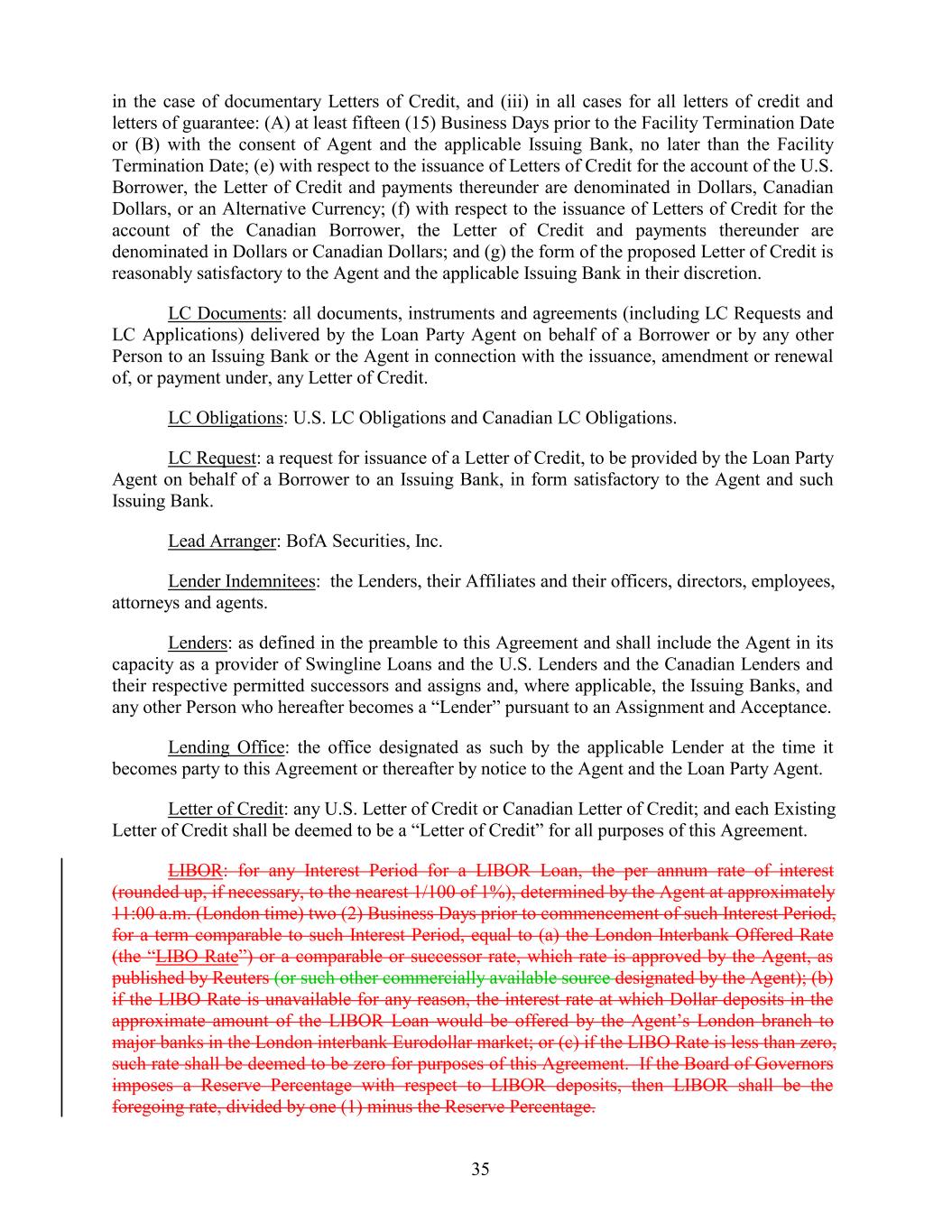 in the case of documentary Letters of Credit, and (iii) in all cases for all letters of credit and letters of guarantee: (A) at least fifteen (15) Business Days prior to the Facility Termination Date or (B) with the consent of Agent and the applicable Issuing Bank, no later than the Facility Termination Date; (e) with respect to the issuance of Letters of Credit for the account of the U.S. Borrower, the Letter of Credit and payments thereunder are denominated in Dollars, Canadian Dollars, or an Alternative Currency; (f) with respect to the issuance of Letters of Credit for the account of the Canadian Borrower, the Letter of Credit and payments thereunder are denominated in Dollars or Canadian Dollars; and (g) the form of the proposed Letter of Credit is reasonably satisfactory to the Agent and the applicable Issuing Bank in their discretion. LC Documents: all documents, instruments and agreements (including LC Requests and LC Applications) delivered by the Loan Party Agent on behalf of a Borrower or by any other Person to an Issuing Bank or the Agent in connection with the issuance, amendment or renewal of, or payment under, any Letter of Credit. LC Obligations: U.S. LC Obligations and Canadian LC Obligations. LC Request: a request for issuance of a Letter of Credit, to be provided by the Loan Party Agent on behalf of a Borrower to an Issuing Bank, in form satisfactory to the Agent and such Issuing Bank. Lead Arranger: BofA Securities, Inc. Lender Indemnitees: the Lenders, their Affiliates and their officers, directors, employees, attorneys and agents. Lenders: as defined in the preamble to this Agreement and shall include the Agent in its capacity as a provider of Swingline Loans and the U.S. Lenders and the Canadian Lenders and their respective permitted successors and assigns and, where applicable, the Issuing Banks, and any other Person who hereafter becomes a “Lender” pursuant to an Assignment and Acceptance. Lending Office: the office designated as such by the applicable Lender at the time it becomes party to this Agreement or thereafter by notice to the Agent and the Loan Party Agent. Letter of Credit: any U.S. Letter of Credit or Canadian Letter of Credit; and each Existing Letter of Credit shall be deemed to be a “Letter of Credit” for all purposes of this Agreement. LIBOR: for any Interest Period for a LIBOR Loan, the per annum rate of interest (rounded up, if necessary, to the nearest 1/100 of 1%), determined by the Agent at approximately 11:00 a.m. (London time) two (2) Business Days prior to commencement of such Interest Period, for a term comparable to such Interest Period, equal to (a) the London Interbank Offered Rate (the “LIBO Rate”) or a comparable or successor rate, which rate is approved by the Agent, as published by Reuters (or such other commercially available source designated by the Agent); (b) if the LIBO Rate is unavailable for any reason, the interest rate at which Dollar deposits in the approximate amount of the LIBOR Loan would be offered by the Agent’s London branch to major banks in the London interbank Eurodollar market; or (c) if the LIBO Rate is less than zero, such rate shall be deemed to be zero for purposes of this Agreement. If the Board of Governors imposes a Reserve Percentage with respect to LIBOR deposits, then LIBOR shall be the foregoing rate, divided by one (1) minus the Reserve Percentage. 35