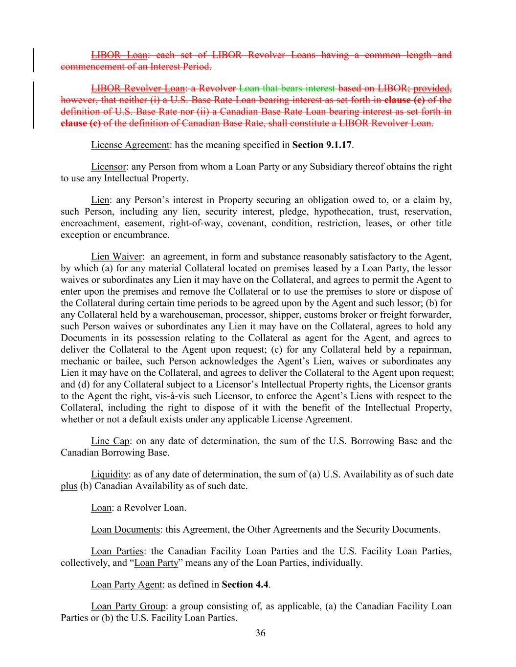 LIBOR Loan: each set of LIBOR Revolver Loans having a common length and commencement of an Interest Period. LIBOR Revolver Loan: a Revolver Loan that bears interest based on LIBOR; provided, however, that neither (i) a U.S. Base Rate Loan bearing interest as set forth in clause (c) of the definition of U.S. Base Rate nor (ii) a Canadian Base Rate Loan bearing interest as set forth in clause (c) of the definition of Canadian Base Rate, shall constitute a LIBOR Revolver Loan. License Agreement: has the meaning specified in Section 9.1.17. Licensor: any Person from whom a Loan Party or any Subsidiary thereof obtains the right to use any Intellectual Property. Lien: any Person’s interest in Property securing an obligation owed to, or a claim by, such Person, including any lien, security interest, pledge, hypothecation, trust, reservation, encroachment, easement, right-of-way, covenant, condition, restriction, leases, or other title exception or encumbrance. Lien Waiver: an agreement, in form and substance reasonably satisfactory to the Agent, by which (a) for any material Collateral located on premises leased by a Loan Party, the lessor waives or subordinates any Lien it may have on the Collateral, and agrees to permit the Agent to enter upon the premises and remove the Collateral or to use the premises to store or dispose of the Collateral during certain time periods to be agreed upon by the Agent and such lessor; (b) for any Collateral held by a warehouseman, processor, shipper, customs broker or freight forwarder, such Person waives or subordinates any Lien it may have on the Collateral, agrees to hold any Documents in its possession relating to the Collateral as agent for the Agent, and agrees to deliver the Collateral to the Agent upon request; (c) for any Collateral held by a repairman, mechanic or bailee, such Person acknowledges the Agent’s Lien, waives or subordinates any Lien it may have on the Collateral, and agrees to deliver the Collateral to the Agent upon request; and (d) for any Collateral subject to a Licensor’s Intellectual Property rights, the Licensor grants to the Agent the right, vis-à-vis such Licensor, to enforce the Agent’s Liens with respect to the Collateral, including the right to dispose of it with the benefit of the Intellectual Property, whether or not a default exists under any applicable License Agreement. Line Cap: on any date of determination, the sum of the U.S. Borrowing Base and the Canadian Borrowing Base. Liquidity: as of any date of determination, the sum of (a) U.S. Availability as of such date plus (b) Canadian Availability as of such date. Loan: a Revolver Loan. Loan Documents: this Agreement, the Other Agreements and the Security Documents. Loan Parties: the Canadian Facility Loan Parties and the U.S. Facility Loan Parties, collectively, and “Loan Party” means any of the Loan Parties, individually. Loan Party Agent: as defined in Section 4.4. Loan Party Group: a group consisting of, as applicable, (a) the Canadian Facility Loan Parties or (b) the U.S. Facility Loan Parties. 36