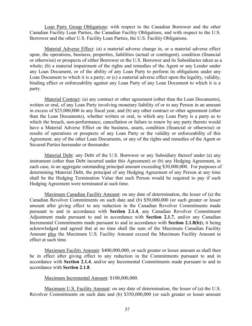 Loan Party Group Obligations: with respect to the Canadian Borrower and the other Canadian Facility Loan Parties, the Canadian Facility Obligations, and with respect to the U.S. Borrower and the other U.S. Facility Loan Parties, the U.S. Facility Obligations. Material Adverse Effect: (a) a material adverse change in, or a material adverse effect upon, the operations, business, properties, liabilities (actual or contingent), condition (financial or otherwise) or prospects of either Borrower or the U.S. Borrower and its Subsidiaries taken as a whole; (b) a material impairment of the rights and remedies of the Agent or any Lender under any Loan Document, or of the ability of any Loan Party to perform its obligations under any Loan Document to which it is a party; or (c) a material adverse effect upon the legality, validity, binding effect or enforceability against any Loan Party of any Loan Document to which it is a party. Material Contract: (a) any contract or other agreement (other than the Loan Documents), written or oral, of any Loan Party involving monetary liability of or to any Person in an amount in excess of $25,000,000 in any fiscal year, and (b) any other contract or other agreement (other than the Loan Documents), whether written or oral, to which any Loan Party is a party as to which the breach, non-performance, cancellation or failure to renew by any party thereto would have a Material Adverse Effect on the business, assets, condition (financial or otherwise) or results of operations or prospects of any Loan Party or the validity or enforceability of this Agreement, any of the other Loan Documents, or any of the rights and remedies of the Agent or Secured Parties hereunder or thereunder. Material Debt: any Debt of the U.S. Borrower or any Subsidiary thereof under (a) any instrument (other than Debt incurred under this Agreement) or (b) any Hedging Agreement, in each case, in an aggregate outstanding principal amount exceeding $30,000,000. For purposes of determining Material Debt, the principal of any Hedging Agreement of any Person at any time shall be the Hedging Termination Value that such Person would be required to pay if such Hedging Agreement were terminated at such time. Maximum Canadian Facility Amount: on any date of determination, the lesser of (a) the Canadian Revolver Commitments on such date and (b) $50,000,000 (or such greater or lesser amount after giving effect to any reduction in the Canadian Revolver Commitments made pursuant to and in accordance with Section 2.1.4, any Canadian Revolver Commitment Adjustment made pursuant to and in accordance with Section 2.1.7, and/or any Canadian Incremental Commitments made pursuant to and in accordance with Section 2.1.8(b)); it being acknowledged and agreed that at no time shall the sum of the Maximum Canadian Facility Amount plus the Maximum U.S. Facility Amount exceed the Maximum Facility Amount in effect at such time. Maximum Facility Amount: $400,000,000, or such greater or lesser amount as shall then be in effect after giving effect to any reduction in the Commitments pursuant to and in accordance with Section 2.1.4, and/or any Incremental Commitments made pursuant to and in accordance with Section 2.1.8. Maximum Incremental Amount: $100,000,000. Maximum U.S. Facility Amount: on any date of determination, the lesser of (a) the U.S. Revolver Commitments on such date and (b) $350,000,000 (or such greater or lesser amount 37