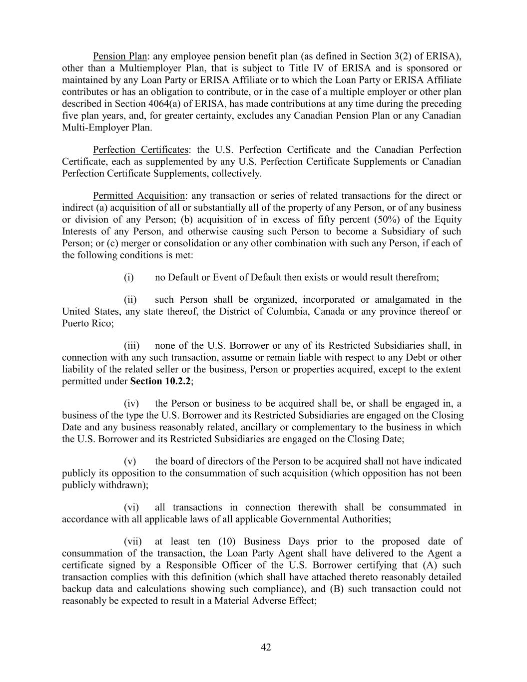Pension Plan: any employee pension benefit plan (as defined in Section 3(2) of ERISA), other than a Multiemployer Plan, that is subject to Title IV of ERISA and is sponsored or maintained by any Loan Party or ERISA Affiliate or to which the Loan Party or ERISA Affiliate contributes or has an obligation to contribute, or in the case of a multiple employer or other plan described in Section 4064(a) of ERISA, has made contributions at any time during the preceding five plan years, and, for greater certainty, excludes any Canadian Pension Plan or any Canadian Multi-Employer Plan. Perfection Certificates: the U.S. Perfection Certificate and the Canadian Perfection Certificate, each as supplemented by any U.S. Perfection Certificate Supplements or Canadian Perfection Certificate Supplements, collectively. Permitted Acquisition: any transaction or series of related transactions for the direct or indirect (a) acquisition of all or substantially all of the property of any Person, or of any business or division of any Person; (b) acquisition of in excess of fifty percent (50%) of the Equity Interests of any Person, and otherwise causing such Person to become a Subsidiary of such Person; or (c) merger or consolidation or any other combination with such any Person, if each of the following conditions is met: (i) no Default or Event of Default then exists or would result therefrom; (ii) such Person shall be organized, incorporated or amalgamated in the United States, any state thereof, the District of Columbia, Canada or any province thereof or Puerto Rico; (iii) none of the U.S. Borrower or any of its Restricted Subsidiaries shall, in connection with any such transaction, assume or remain liable with respect to any Debt or other liability of the related seller or the business, Person or properties acquired, except to the extent permitted under Section 10.2.2; (iv) the Person or business to be acquired shall be, or shall be engaged in, a business of the type the U.S. Borrower and its Restricted Subsidiaries are engaged on the Closing Date and any business reasonably related, ancillary or complementary to the business in which the U.S. Borrower and its Restricted Subsidiaries are engaged on the Closing Date; (v) the board of directors of the Person to be acquired shall not have indicated publicly its opposition to the consummation of such acquisition (which opposition has not been publicly withdrawn); (vi) all transactions in connection therewith shall be consummated in accordance with all applicable laws of all applicable Governmental Authorities; (vii) at least ten (10) Business Days prior to the proposed date of consummation of the transaction, the Loan Party Agent shall have delivered to the Agent a certificate signed by a Responsible Officer of the U.S. Borrower certifying that (A) such transaction complies with this definition (which shall have attached thereto reasonably detailed backup data and calculations showing such compliance), and (B) such transaction could not reasonably be expected to result in a Material Adverse Effect; 42