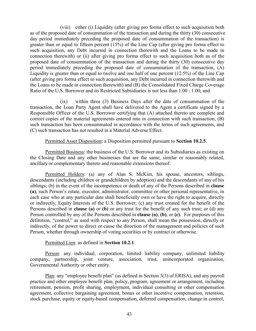 (viii) either (i) Liquidity (after giving pro forma effect to such acquisition both as of the proposed date of consummation of the transaction and during the thirty (30) consecutive day period immediately preceding the proposed date of consummation of the transaction) is greater than or equal to fifteen percent (15%) of the Line Cap (after giving pro forma effect to such acquisition, any Debt incurred in connection therewith and the Loans to be made in connection therewith) or (ii) after giving pro forma effect to such acquisition both as of the proposed date of consummation of the transaction and during the thirty (30) consecutive day period immediately preceding the proposed date of consummation of the transaction, (A) Liquidity is greater than or equal to twelve and one half of one percent (12.5%) of the Line Cap (after giving pro forma effect to such acquisition, any Debt incurred in connection therewith and the Loans to be made in connection therewith) and (B) the Consolidated Fixed Charge Coverage Ratio of the U.S. Borrower and its Restricted Subsidiaries is not less than 1.00 : 1.00; and (ix) within three (3) Business Days after the date of consummation of the transaction, the Loan Party Agent shall have delivered to the Agent a certificate signed by a Responsible Officer of the U.S. Borrower certifying that (A) attached thereto are complete and correct copies of the material agreements entered into in connection with such transaction, (B) such transaction has been consummated in accordance with the terms of such agreements, and (C) such transaction has not resulted in a Material Adverse Effect. Permitted Asset Disposition: a Disposition permitted pursuant to Section 10.2.5. Permitted Business: the business of the U.S. Borrower and its Subsidiaries as existing on the Closing Date and any other businesses that are the same, similar or reasonably related, ancillary or complementary thereto and reasonable extensions thereof. Permitted Holders: (a) any of Alan S. McKim, his spouse, ancestors, siblings, descendants (including children or grandchildren by adoption) and the descendants of any of his siblings; (b) in the event of the incompetence or death of any of the Persons described in clause (a), such Person’s estate, executor, administrator, committee or other personal representative, in each case who at any particular date shall beneficially own or have the right to acquire, directly or indirectly, Equity Interests of the U.S. Borrower; (c) any trust created for the benefit of the Persons described in clause (a) or (b) or any trust for the benefit of any such trust; or (d) any Person controlled by any of the Persons described in clause (a), (b), or (c). For purposes of this definition, “control,” as used with respect to any Person, shall mean the possession, directly or indirectly, of the power to direct or cause the direction of the management and policies of such Person, whether through ownership of voting securities or by contract or otherwise. Permitted Lien: as defined in Section 10.2.1. Person: any individual, corporation, limited liability company, unlimited liability company, partnership, joint venture, association, trust, unincorporated organization, Governmental Authority or other entity. Plan: any “employee benefit plan” (as defined in Section 3(3) of ERISA), and any payroll practice and other employee benefit plan, policy, program, agreement or arrangement, including retirement, pension, profit sharing, employment, individual consulting or other compensation agreement, collective bargaining agreement, bonus or other incentive compensation, retention, stock purchase, equity or equity-based compensation, deferred compensation, change in control, 43