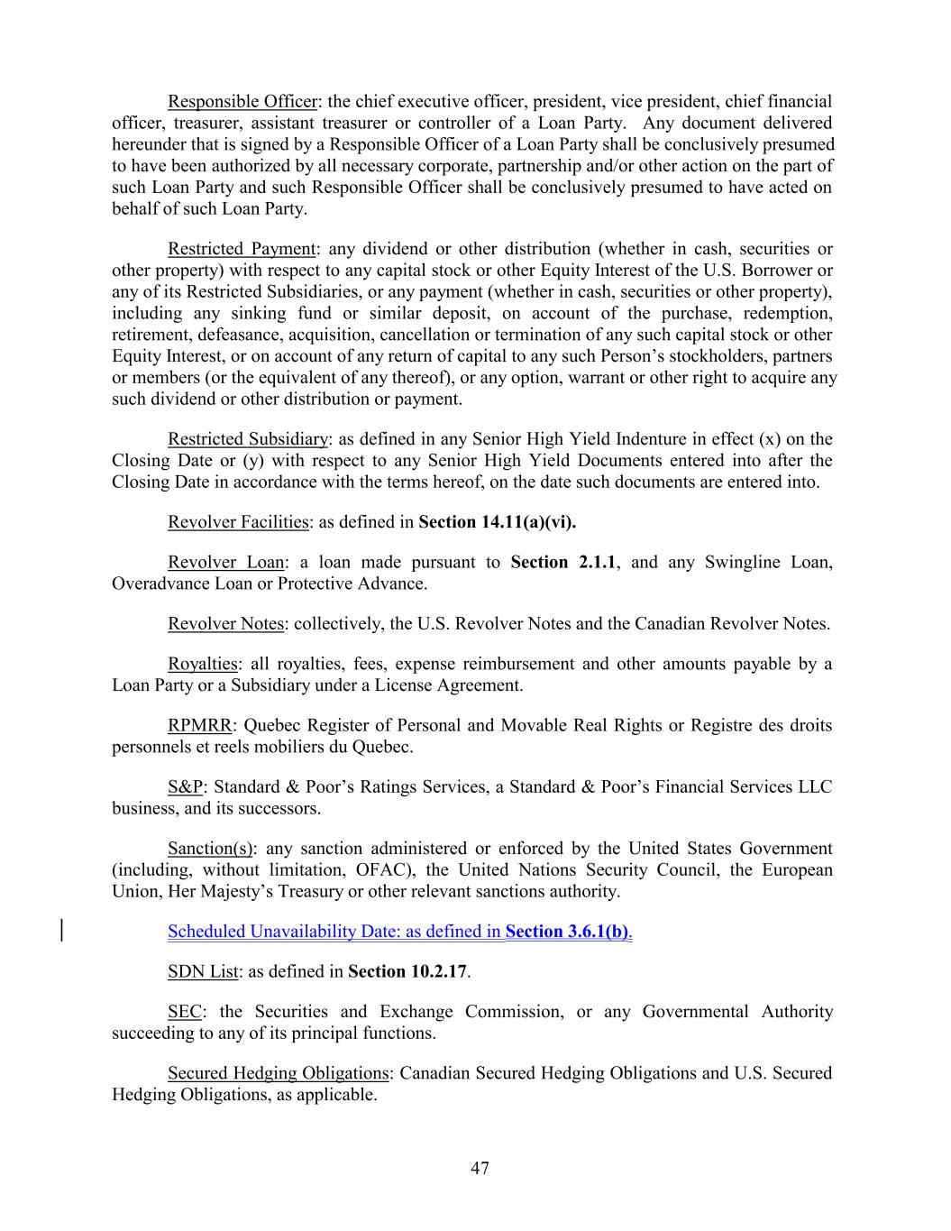 Responsible Officer: the chief executive officer, president, vice president, chief financial officer, treasurer, assistant treasurer or controller of a Loan Party. Any document delivered hereunder that is signed by a Responsible Officer of a Loan Party shall be conclusively presumed to have been authorized by all necessary corporate, partnership and/or other action on the part of such Loan Party and such Responsible Officer shall be conclusively presumed to have acted on behalf of such Loan Party. Restricted Payment: any dividend or other distribution (whether in cash, securities or other property) with respect to any capital stock or other Equity Interest of the U.S. Borrower or any of its Restricted Subsidiaries, or any payment (whether in cash, securities or other property), including any sinking fund or similar deposit, on account of the purchase, redemption, retirement, defeasance, acquisition, cancellation or termination of any such capital stock or other Equity Interest, or on account of any return of capital to any such Person’s stockholders, partners or members (or the equivalent of any thereof), or any option, warrant or other right to acquire any such dividend or other distribution or payment. Restricted Subsidiary: as defined in any Senior High Yield Indenture in effect (x) on the Closing Date or (y) with respect to any Senior High Yield Documents entered into after the Closing Date in accordance with the terms hereof, on the date such documents are entered into. Revolver Facilities: as defined in Section 14.11(a)(vi). Revolver Loan: a loan made pursuant to Section 2.1.1, and any Swingline Loan, Overadvance Loan or Protective Advance. Revolver Notes: collectively, the U.S. Revolver Notes and the Canadian Revolver Notes. Royalties: all royalties, fees, expense reimbursement and other amounts payable by a Loan Party or a Subsidiary under a License Agreement. RPMRR: Quebec Register of Personal and Movable Real Rights or Registre des droits personnels et reels mobiliers du Quebec. S&P: Standard & Poor’s Ratings Services, a Standard & Poor’s Financial Services LLC business, and its successors. Sanction(s): any sanction administered or enforced by the United States Government (including, without limitation, OFAC), the United Nations Security Council, the European Union, Her Majesty’s Treasury or other relevant sanctions authority. Scheduled Unavailability Date: as defined in Section 3.6.1(b). SDN List: as defined in Section 10.2.17. SEC: the Securities and Exchange Commission, or any Governmental Authority succeeding to any of its principal functions. Secured Hedging Obligations: Canadian Secured Hedging Obligations and U.S. Secured Hedging Obligations, as applicable. 47