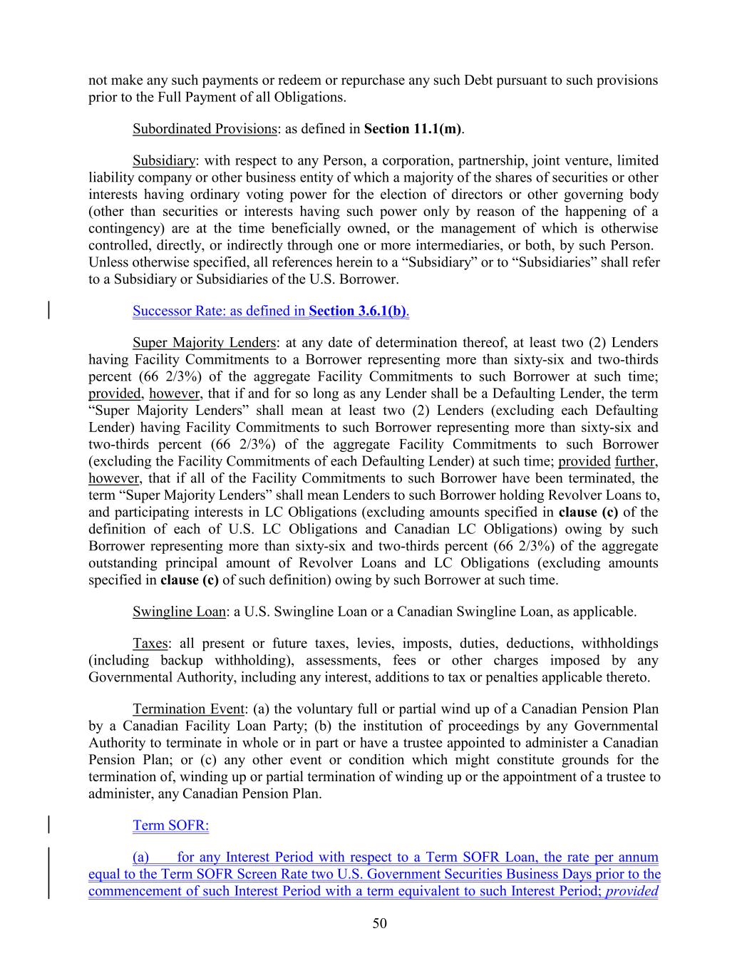 not make any such payments or redeem or repurchase any such Debt pursuant to such provisions prior to the Full Payment of all Obligations. Subordinated Provisions: as defined in Section 11.1(m). Subsidiary: with respect to any Person, a corporation, partnership, joint venture, limited liability company or other business entity of which a majority of the shares of securities or other interests having ordinary voting power for the election of directors or other governing body (other than securities or interests having such power only by reason of the happening of a contingency) are at the time beneficially owned, or the management of which is otherwise controlled, directly, or indirectly through one or more intermediaries, or both, by such Person. Unless otherwise specified, all references herein to a “Subsidiary” or to “Subsidiaries” shall refer to a Subsidiary or Subsidiaries of the U.S. Borrower. Successor Rate: as defined in Section 3.6.1(b). Super Majority Lenders: at any date of determination thereof, at least two (2) Lenders having Facility Commitments to a Borrower representing more than sixty-six and two-thirds percent (66 2/3%) of the aggregate Facility Commitments to such Borrower at such time; provided, however, that if and for so long as any Lender shall be a Defaulting Lender, the term “Super Majority Lenders” shall mean at least two (2) Lenders (excluding each Defaulting Lender) having Facility Commitments to such Borrower representing more than sixty-six and two-thirds percent (66 2/3%) of the aggregate Facility Commitments to such Borrower (excluding the Facility Commitments of each Defaulting Lender) at such time; provided further, however, that if all of the Facility Commitments to such Borrower have been terminated, the term “Super Majority Lenders” shall mean Lenders to such Borrower holding Revolver Loans to, and participating interests in LC Obligations (excluding amounts specified in clause (c) of the definition of each of U.S. LC Obligations and Canadian LC Obligations) owing by such Borrower representing more than sixty-six and two-thirds percent (66 2/3%) of the aggregate outstanding principal amount of Revolver Loans and LC Obligations (excluding amounts specified in clause (c) of such definition) owing by such Borrower at such time. Swingline Loan: a U.S. Swingline Loan or a Canadian Swingline Loan, as applicable. Taxes: all present or future taxes, levies, imposts, duties, deductions, withholdings (including backup withholding), assessments, fees or other charges imposed by any Governmental Authority, including any interest, additions to tax or penalties applicable thereto. Termination Event: (a) the voluntary full or partial wind up of a Canadian Pension Plan by a Canadian Facility Loan Party; (b) the institution of proceedings by any Governmental Authority to terminate in whole or in part or have a trustee appointed to administer a Canadian Pension Plan; or (c) any other event or condition which might constitute grounds for the termination of, winding up or partial termination of winding up or the appointment of a trustee to administer, any Canadian Pension Plan. Term SOFR: (a) for any Interest Period with respect to a Term SOFR Loan, the rate per annum equal to the Term SOFR Screen Rate two U.S. Government Securities Business Days prior to the commencement of such Interest Period with a term equivalent to such Interest Period; provided 50