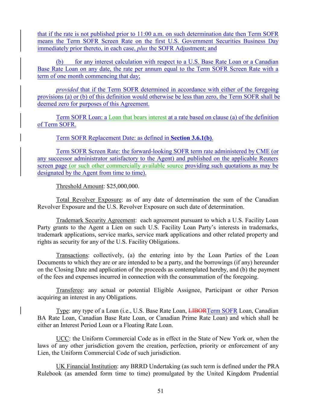 that if the rate is not published prior to 11:00 a.m. on such determination date then Term SOFR means the Term SOFR Screen Rate on the first U.S. Government Securities Business Day immediately prior thereto, in each case, plus the SOFR Adjustment; and (b) for any interest calculation with respect to a U.S. Base Rate Loan or a Canadian Base Rate Loan on any date, the rate per annum equal to the Term SOFR Screen Rate with a term of one month commencing that day; provided that if the Term SOFR determined in accordance with either of the foregoing provisions (a) or (b) of this definition would otherwise be less than zero, the Term SOFR shall be deemed zero for purposes of this Agreement. Term SOFR Loan: a Loan that bears interest at a rate based on clause (a) of the definition of Term SOFR. Term SOFR Replacement Date: as defined in Section 3.6.1(b). Term SOFR Screen Rate: the forward-looking SOFR term rate administered by CME (or any successor administrator satisfactory to the Agent) and published on the applicable Reuters screen page (or such other commercially available source providing such quotations as may be designated by the Agent from time to time). Threshold Amount: $25,000,000. Total Revolver Exposure: as of any date of determination the sum of the Canadian Revolver Exposure and the U.S. Revolver Exposure on such date of determination. Trademark Security Agreement: each agreement pursuant to which a U.S. Facility Loan Party grants to the Agent a Lien on such U.S. Facility Loan Party’s interests in trademarks, trademark applications, service marks, service mark applications and other related property and rights as security for any of the U.S. Facility Obligations. Transactions: collectively, (a) the entering into by the Loan Parties of the Loan Documents to which they are or are intended to be a party, and the borrowings (if any) hereunder on the Closing Date and application of the proceeds as contemplated hereby, and (b) the payment of the fees and expenses incurred in connection with the consummation of the foregoing. Transferee: any actual or potential Eligible Assignee, Participant or other Person acquiring an interest in any Obligations. Type: any type of a Loan (i.e., U.S. Base Rate Loan, LIBORTerm SOFR Loan, Canadian BA Rate Loan, Canadian Base Rate Loan, or Canadian Prime Rate Loan) and which shall be either an Interest Period Loan or a Floating Rate Loan. UCC: the Uniform Commercial Code as in effect in the State of New York or, when the laws of any other jurisdiction govern the creation, perfection, priority or enforcement of any Lien, the Uniform Commercial Code of such jurisdiction. UK Financial Institution: any BRRD Undertaking (as such term is defined under the PRA Rulebook (as amended form time to time) promulgated by the United Kingdom Prudential 51
