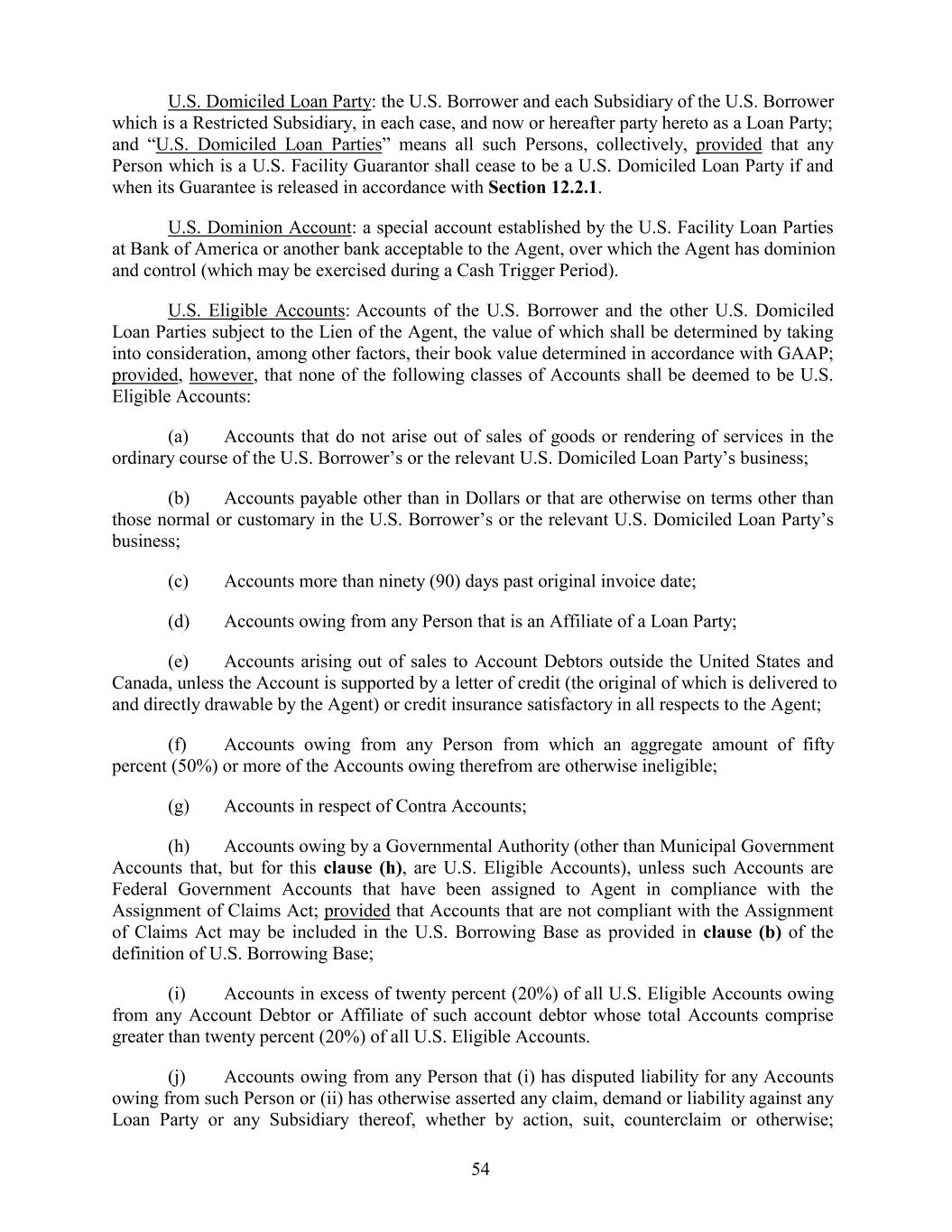 U.S. Domiciled Loan Party: the U.S. Borrower and each Subsidiary of the U.S. Borrower which is a Restricted Subsidiary, in each case, and now or hereafter party hereto as a Loan Party; and “U.S. Domiciled Loan Parties” means all such Persons, collectively, provided that any Person which is a U.S. Facility Guarantor shall cease to be a U.S. Domiciled Loan Party if and when its Guarantee is released in accordance with Section 12.2.1. U.S. Dominion Account: a special account established by the U.S. Facility Loan Parties at Bank of America or another bank acceptable to the Agent, over which the Agent has dominion and control (which may be exercised during a Cash Trigger Period). U.S. Eligible Accounts: Accounts of the U.S. Borrower and the other U.S. Domiciled Loan Parties subject to the Lien of the Agent, the value of which shall be determined by taking into consideration, among other factors, their book value determined in accordance with GAAP; provided, however, that none of the following classes of Accounts shall be deemed to be U.S. Eligible Accounts: (a) Accounts that do not arise out of sales of goods or rendering of services in the ordinary course of the U.S. Borrower’s or the relevant U.S. Domiciled Loan Party’s business; (b) Accounts payable other than in Dollars or that are otherwise on terms other than those normal or customary in the U.S. Borrower’s or the relevant U.S. Domiciled Loan Party’s business; (c) Accounts more than ninety (90) days past original invoice date; (d) Accounts owing from any Person that is an Affiliate of a Loan Party; (e) Accounts arising out of sales to Account Debtors outside the United States and Canada, unless the Account is supported by a letter of credit (the original of which is delivered to and directly drawable by the Agent) or credit insurance satisfactory in all respects to the Agent; (f) Accounts owing from any Person from which an aggregate amount of fifty percent (50%) or more of the Accounts owing therefrom are otherwise ineligible; (g) Accounts in respect of Contra Accounts; (h) Accounts owing by a Governmental Authority (other than Municipal Government Accounts that, but for this clause (h), are U.S. Eligible Accounts), unless such Accounts are Federal Government Accounts that have been assigned to Agent in compliance with the Assignment of Claims Act; provided that Accounts that are not compliant with the Assignment of Claims Act may be included in the U.S. Borrowing Base as provided in clause (b) of the definition of U.S. Borrowing Base; (i) Accounts in excess of twenty percent (20%) of all U.S. Eligible Accounts owing from any Account Debtor or Affiliate of such account debtor whose total Accounts comprise greater than twenty percent (20%) of all U.S. Eligible Accounts. (j) Accounts owing from any Person that (i) has disputed liability for any Accounts owing from such Person or (ii) has otherwise asserted any claim, demand or liability against any Loan Party or any Subsidiary thereof, whether by action, suit, counterclaim or otherwise; 54