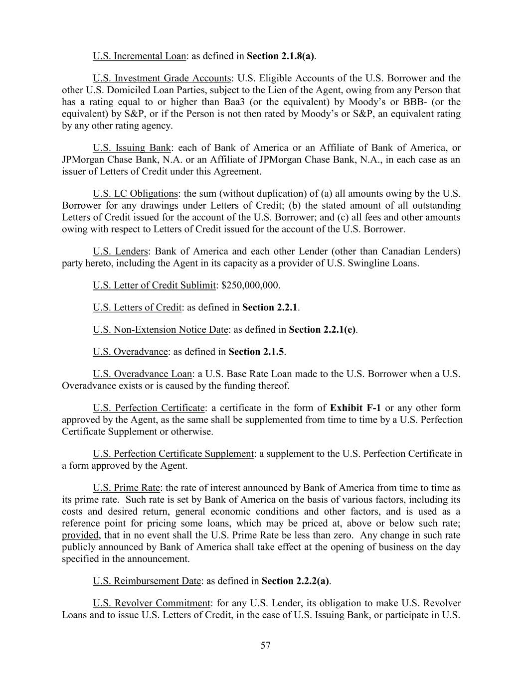 U.S. Incremental Loan: as defined in Section 2.1.8(a). U.S. Investment Grade Accounts: U.S. Eligible Accounts of the U.S. Borrower and the other U.S. Domiciled Loan Parties, subject to the Lien of the Agent, owing from any Person that has a rating equal to or higher than Baa3 (or the equivalent) by Moody’s or BBB- (or the equivalent) by S&P, or if the Person is not then rated by Moody’s or S&P, an equivalent rating by any other rating agency. U.S. Issuing Bank: each of Bank of America or an Affiliate of Bank of America, or JPMorgan Chase Bank, N.A. or an Affiliate of JPMorgan Chase Bank, N.A., in each case as an issuer of Letters of Credit under this Agreement. U.S. LC Obligations: the sum (without duplication) of (a) all amounts owing by the U.S. Borrower for any drawings under Letters of Credit; (b) the stated amount of all outstanding Letters of Credit issued for the account of the U.S. Borrower; and (c) all fees and other amounts owing with respect to Letters of Credit issued for the account of the U.S. Borrower. U.S. Lenders: Bank of America and each other Lender (other than Canadian Lenders) party hereto, including the Agent in its capacity as a provider of U.S. Swingline Loans. U.S. Letter of Credit Sublimit: $250,000,000. U.S. Letters of Credit: as defined in Section 2.2.1. U.S. Non-Extension Notice Date: as defined in Section 2.2.1(e). U.S. Overadvance: as defined in Section 2.1.5. U.S. Overadvance Loan: a U.S. Base Rate Loan made to the U.S. Borrower when a U.S. Overadvance exists or is caused by the funding thereof. U.S. Perfection Certificate: a certificate in the form of Exhibit F-1 or any other form approved by the Agent, as the same shall be supplemented from time to time by a U.S. Perfection Certificate Supplement or otherwise. U.S. Perfection Certificate Supplement: a supplement to the U.S. Perfection Certificate in a form approved by the Agent. U.S. Prime Rate: the rate of interest announced by Bank of America from time to time as its prime rate. Such rate is set by Bank of America on the basis of various factors, including its costs and desired return, general economic conditions and other factors, and is used as a reference point for pricing some loans, which may be priced at, above or below such rate; provided, that in no event shall the U.S. Prime Rate be less than zero. Any change in such rate publicly announced by Bank of America shall take effect at the opening of business on the day specified in the announcement. U.S. Reimbursement Date: as defined in Section 2.2.2(a). U.S. Revolver Commitment: for any U.S. Lender, its obligation to make U.S. Revolver Loans and to issue U.S. Letters of Credit, in the case of U.S. Issuing Bank, or participate in U.S. 57