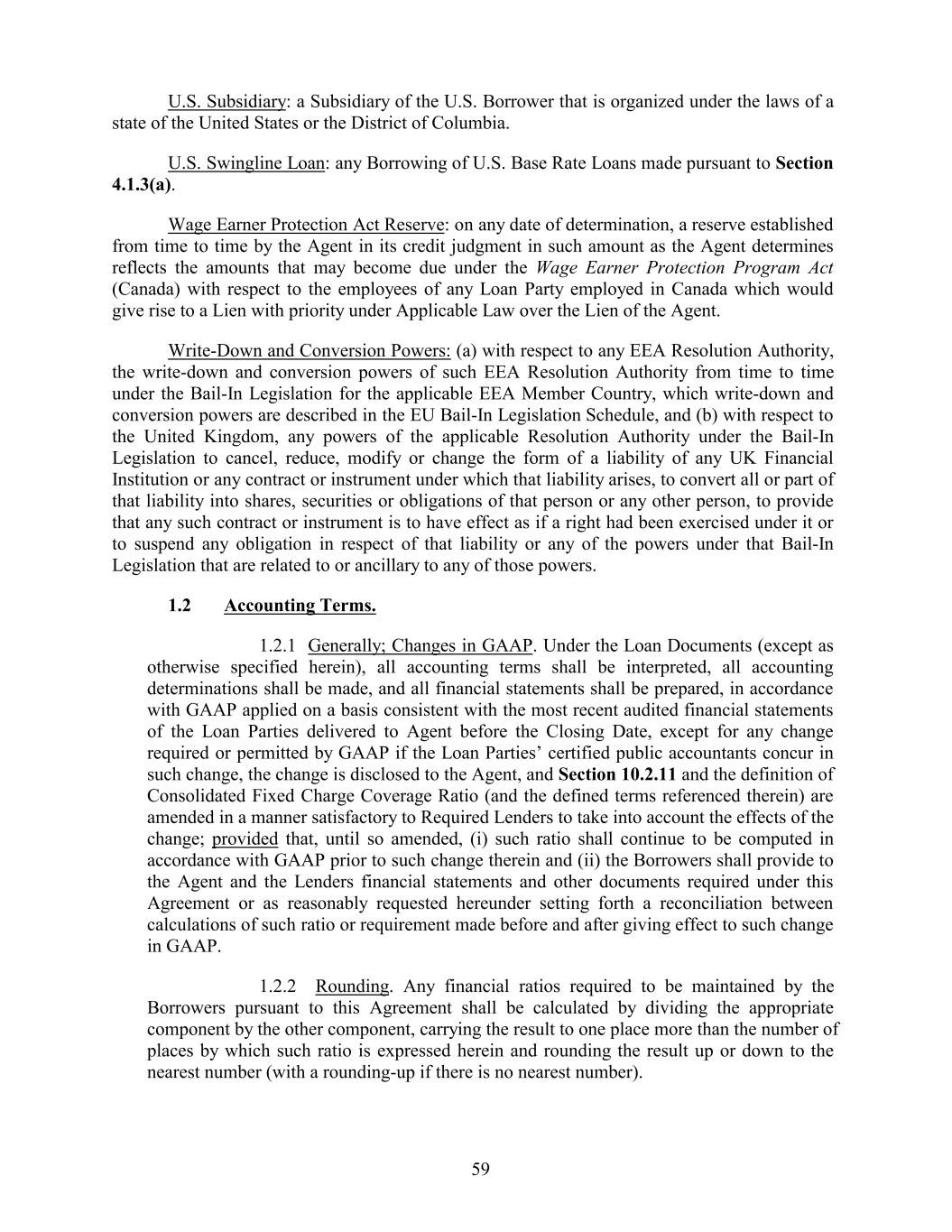 U.S. Subsidiary: a Subsidiary of the U.S. Borrower that is organized under the laws of a state of the United States or the District of Columbia. U.S. Swingline Loan: any Borrowing of U.S. Base Rate Loans made pursuant to Section 4.1.3(a). Wage Earner Protection Act Reserve: on any date of determination, a reserve established from time to time by the Agent in its credit judgment in such amount as the Agent determines reflects the amounts that may become due under the Wage Earner Protection Program Act (Canada) with respect to the employees of any Loan Party employed in Canada which would give rise to a Lien with priority under Applicable Law over the Lien of the Agent. Write-Down and Conversion Powers: (a) with respect to any EEA Resolution Authority, the write-down and conversion powers of such EEA Resolution Authority from time to time under the Bail-In Legislation for the applicable EEA Member Country, which write-down and conversion powers are described in the EU Bail-In Legislation Schedule, and (b) with respect to the United Kingdom, any powers of the applicable Resolution Authority under the Bail-In Legislation to cancel, reduce, modify or change the form of a liability of any UK Financial Institution or any contract or instrument under which that liability arises, to convert all or part of that liability into shares, securities or obligations of that person or any other person, to provide that any such contract or instrument is to have effect as if a right had been exercised under it or to suspend any obligation in respect of that liability or any of the powers under that Bail-In Legislation that are related to or ancillary to any of those powers. 1.2 Accounting Terms. 1.2.1 Generally; Changes in GAAP. Under the Loan Documents (except as otherwise specified herein), all accounting terms shall be interpreted, all accounting determinations shall be made, and all financial statements shall be prepared, in accordance with GAAP applied on a basis consistent with the most recent audited financial statements of the Loan Parties delivered to Agent before the Closing Date, except for any change required or permitted by GAAP if the Loan Parties’ certified public accountants concur in such change, the change is disclosed to the Agent, and Section 10.2.11 and the definition of Consolidated Fixed Charge Coverage Ratio (and the defined terms referenced therein) are amended in a manner satisfactory to Required Lenders to take into account the effects of the change; provided that, until so amended, (i) such ratio shall continue to be computed in accordance with GAAP prior to such change therein and (ii) the Borrowers shall provide to the Agent and the Lenders financial statements and other documents required under this Agreement or as reasonably requested hereunder setting forth a reconciliation between calculations of such ratio or requirement made before and after giving effect to such change in GAAP. 1.2.2 Rounding. Any financial ratios required to be maintained by the Borrowers pursuant to this Agreement shall be calculated by dividing the appropriate component by the other component, carrying the result to one place more than the number of places by which such ratio is expressed herein and rounding the result up or down to the nearest number (with a rounding-up if there is no nearest number). 59