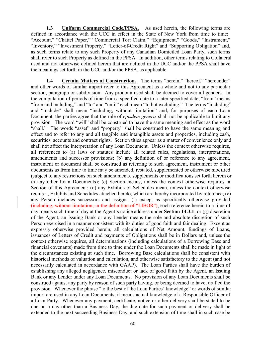1.3 Uniform Commercial Code/PPSA. As used herein, the following terms are defined in accordance with the UCC in effect in the State of New York from time to time: “Account,” “Chattel Paper,” “Commercial Tort Claim,” “Equipment,” “Goods,” “Instrument,” “Inventory,” “Investment Property,” “Letter-of-Credit Right” and “Supporting Obligation” and, as such terms relate to any such Property of any Canadian Domiciled Loan Party, such terms shall refer to such Property as defined in the PPSA. In addition, other terms relating to Collateral used and not otherwise defined herein that are defined in the UCC and/or the PPSA shall have the meanings set forth in the UCC and/or the PPSA, as applicable. 1.4 Certain Matters of Construction. The terms “herein,” “hereof,” “hereunder” and other words of similar import refer to this Agreement as a whole and not to any particular section, paragraph or subdivision. Any pronoun used shall be deemed to cover all genders. In the computation of periods of time from a specified date to a later specified date, “from” means “from and including,” and “to” and “until” each mean “to but excluding.” The terms “including” and “include” shall mean “including, without limitation” and, for purposes of each Loan Document, the parties agree that the rule of ejusdem generis shall not be applicable to limit any provision. The word “will” shall be construed to have the same meaning and effect as the word “shall.” The words “asset” and “property” shall be construed to have the same meaning and effect and to refer to any and all tangible and intangible assets and properties, including cash, securities, accounts and contract rights. Section titles appear as a matter of convenience only and shall not affect the interpretation of any Loan Document. Unless the context otherwise requires, all references to (a) laws or statutes include all related rules, regulations, interpretations, amendments and successor provisions; (b) any definition of or reference to any agreement, instrument or document shall be construed as referring to such agreement, instrument or other documents as from time to time may be amended, restated, supplemented or otherwise modified (subject to any restrictions on such amendments, supplements or modifications set forth herein or in any other Loan Documents); (c) Section means, unless the context otherwise requires, a Section of this Agreement; (d) any Exhibits or Schedules mean, unless the context otherwise requires, Exhibits and Schedules attached hereto, which are hereby incorporated by reference; (e) any Person includes successors and assigns; (f) except as specifically otherwise provided (including, without limitation, in the definition of “LIBOR”), each reference herein to a time of day means such time of day at the Agent’s notice address under Section 14.3.1; or (g) discretion of the Agent, an Issuing Bank or any Lender means the sole and absolute discretion of such Person exercised in a manner consistent with its duties of good faith and fair dealing. Except as expressly otherwise provided herein, all calculations of Net Amount, fundings of Loans, issuances of Letters of Credit and payments of Obligations shall be in Dollars and, unless the context otherwise requires, all determinations (including calculations of a Borrowing Base and financial covenants) made from time to time under the Loan Documents shall be made in light of the circumstances existing at such time. Borrowing Base calculations shall be consistent with historical methods of valuation and calculation, and otherwise satisfactory to the Agent (and not necessarily calculated in accordance with GAAP). The Loan Parties shall have the burden of establishing any alleged negligence, misconduct or lack of good faith by the Agent, an Issuing Bank or any Lender under any Loan Documents. No provision of any Loan Documents shall be construed against any party by reason of such party having, or being deemed to have, drafted the provision. Whenever the phrase “to the best of the Loan Parties’ knowledge” or words of similar import are used in any Loan Documents, it means actual knowledge of a Responsible Officer of a Loan Party. Whenever any payment, certificate, notice or other delivery shall be stated to be due on a day other than a Business Day, the due date for such payment or delivery shall be extended to the next succeeding Business Day, and such extension of time shall in such case be 60