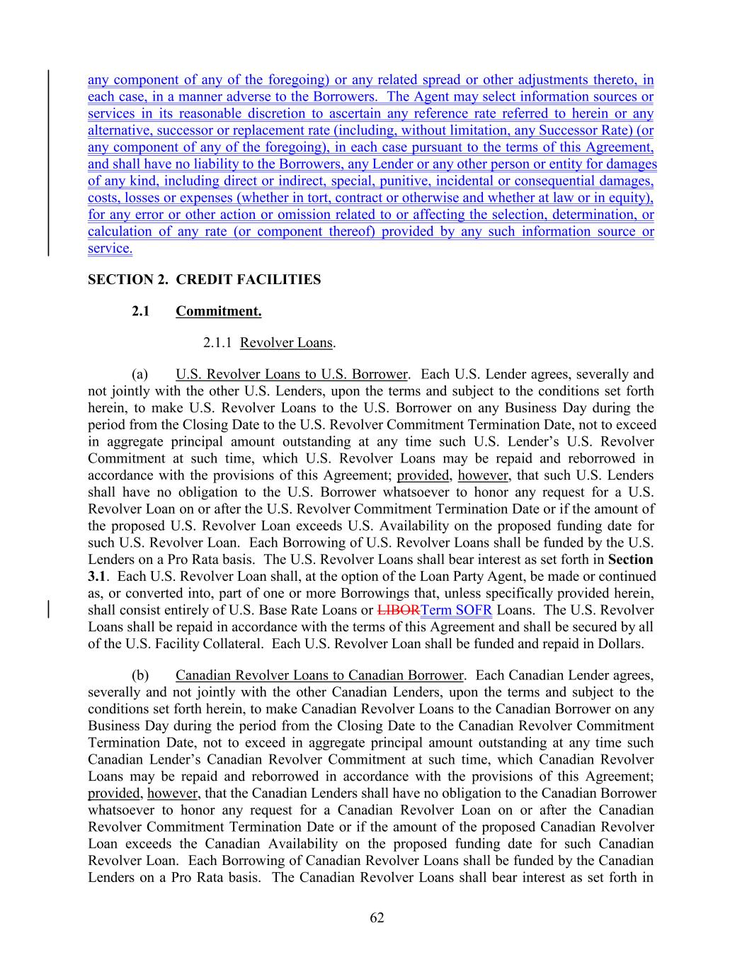 any component of any of the foregoing) or any related spread or other adjustments thereto, in each case, in a manner adverse to the Borrowers. The Agent may select information sources or services in its reasonable discretion to ascertain any reference rate referred to herein or any alternative, successor or replacement rate (including, without limitation, any Successor Rate) (or any component of any of the foregoing), in each case pursuant to the terms of this Agreement, and shall have no liability to the Borrowers, any Lender or any other person or entity for damages of any kind, including direct or indirect, special, punitive, incidental or consequential damages, costs, losses or expenses (whether in tort, contract or otherwise and whether at law or in equity), for any error or other action or omission related to or affecting the selection, determination, or calculation of any rate (or component thereof) provided by any such information source or service. SECTION 2. CREDIT FACILITIES 2.1 Commitment. 2.1.1 Revolver Loans. (a) U.S. Revolver Loans to U.S. Borrower. Each U.S. Lender agrees, severally and not jointly with the other U.S. Lenders, upon the terms and subject to the conditions set forth herein, to make U.S. Revolver Loans to the U.S. Borrower on any Business Day during the period from the Closing Date to the U.S. Revolver Commitment Termination Date, not to exceed in aggregate principal amount outstanding at any time such U.S. Lender’s U.S. Revolver Commitment at such time, which U.S. Revolver Loans may be repaid and reborrowed in accordance with the provisions of this Agreement; provided, however, that such U.S. Lenders shall have no obligation to the U.S. Borrower whatsoever to honor any request for a U.S. Revolver Loan on or after the U.S. Revolver Commitment Termination Date or if the amount of the proposed U.S. Revolver Loan exceeds U.S. Availability on the proposed funding date for such U.S. Revolver Loan. Each Borrowing of U.S. Revolver Loans shall be funded by the U.S. Lenders on a Pro Rata basis. The U.S. Revolver Loans shall bear interest as set forth in Section 3.1. Each U.S. Revolver Loan shall, at the option of the Loan Party Agent, be made or continued as, or converted into, part of one or more Borrowings that, unless specifically provided herein, shall consist entirely of U.S. Base Rate Loans or LIBORTerm SOFR Loans. The U.S. Revolver Loans shall be repaid in accordance with the terms of this Agreement and shall be secured by all of the U.S. Facility Collateral. Each U.S. Revolver Loan shall be funded and repaid in Dollars. (b) Canadian Revolver Loans to Canadian Borrower. Each Canadian Lender agrees, severally and not jointly with the other Canadian Lenders, upon the terms and subject to the conditions set forth herein, to make Canadian Revolver Loans to the Canadian Borrower on any Business Day during the period from the Closing Date to the Canadian Revolver Commitment Termination Date, not to exceed in aggregate principal amount outstanding at any time such Canadian Lender’s Canadian Revolver Commitment at such time, which Canadian Revolver Loans may be repaid and reborrowed in accordance with the provisions of this Agreement; provided, however, that the Canadian Lenders shall have no obligation to the Canadian Borrower whatsoever to honor any request for a Canadian Revolver Loan on or after the Canadian Revolver Commitment Termination Date or if the amount of the proposed Canadian Revolver Loan exceeds the Canadian Availability on the proposed funding date for such Canadian Revolver Loan. Each Borrowing of Canadian Revolver Loans shall be funded by the Canadian Lenders on a Pro Rata basis. The Canadian Revolver Loans shall bear interest as set forth in 62