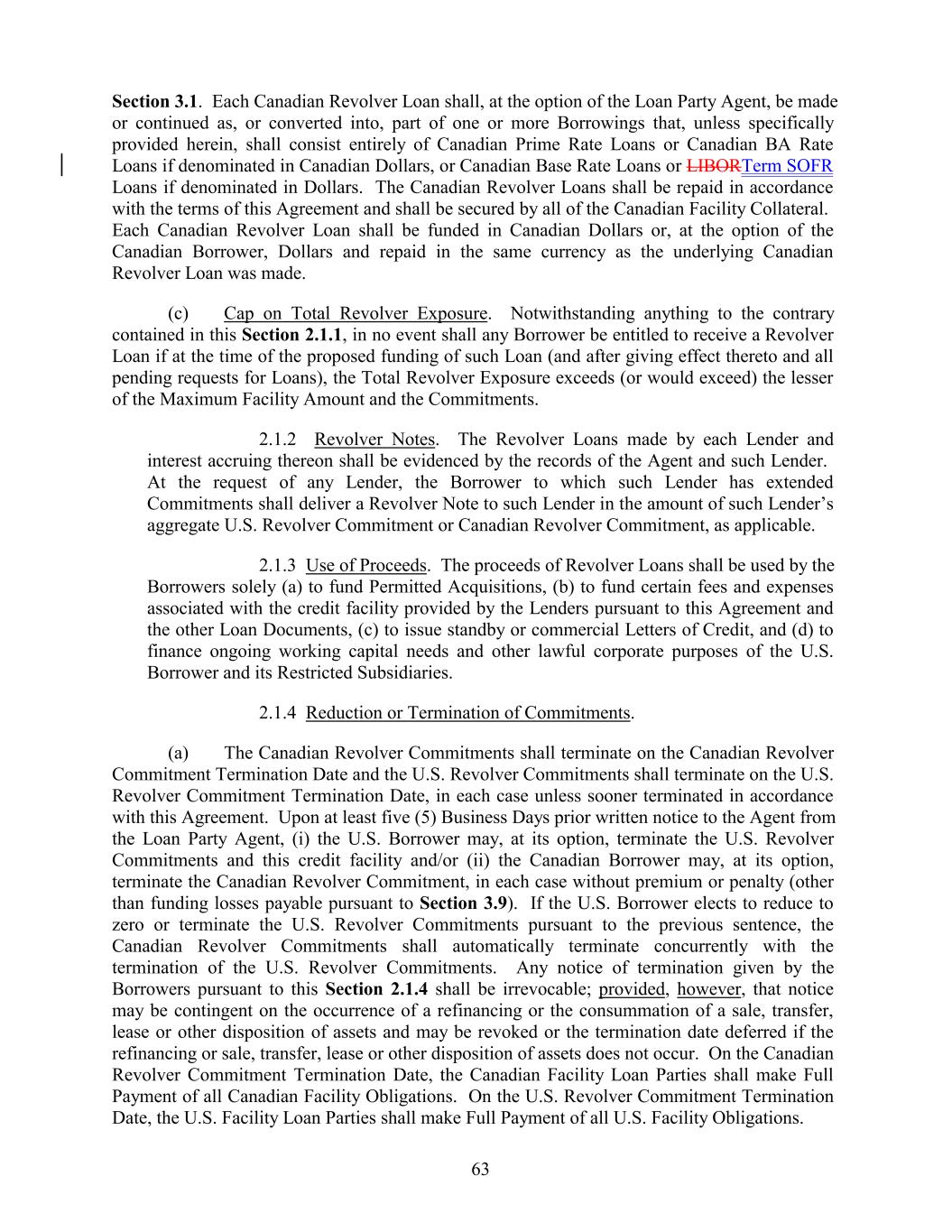 Section 3.1. Each Canadian Revolver Loan shall, at the option of the Loan Party Agent, be made or continued as, or converted into, part of one or more Borrowings that, unless specifically provided herein, shall consist entirely of Canadian Prime Rate Loans or Canadian BA Rate Loans if denominated in Canadian Dollars, or Canadian Base Rate Loans or LIBORTerm SOFR Loans if denominated in Dollars. The Canadian Revolver Loans shall be repaid in accordance with the terms of this Agreement and shall be secured by all of the Canadian Facility Collateral. Each Canadian Revolver Loan shall be funded in Canadian Dollars or, at the option of the Canadian Borrower, Dollars and repaid in the same currency as the underlying Canadian Revolver Loan was made. (c) Cap on Total Revolver Exposure. Notwithstanding anything to the contrary contained in this Section 2.1.1, in no event shall any Borrower be entitled to receive a Revolver Loan if at the time of the proposed funding of such Loan (and after giving effect thereto and all pending requests for Loans), the Total Revolver Exposure exceeds (or would exceed) the lesser of the Maximum Facility Amount and the Commitments. 2.1.2 Revolver Notes. The Revolver Loans made by each Lender and interest accruing thereon shall be evidenced by the records of the Agent and such Lender. At the request of any Lender, the Borrower to which such Lender has extended Commitments shall deliver a Revolver Note to such Lender in the amount of such Lender’s aggregate U.S. Revolver Commitment or Canadian Revolver Commitment, as applicable. 2.1.3 Use of Proceeds. The proceeds of Revolver Loans shall be used by the Borrowers solely (a) to fund Permitted Acquisitions, (b) to fund certain fees and expenses associated with the credit facility provided by the Lenders pursuant to this Agreement and the other Loan Documents, (c) to issue standby or commercial Letters of Credit, and (d) to finance ongoing working capital needs and other lawful corporate purposes of the U.S. Borrower and its Restricted Subsidiaries. 2.1.4 Reduction or Termination of Commitments. (a) The Canadian Revolver Commitments shall terminate on the Canadian Revolver Commitment Termination Date and the U.S. Revolver Commitments shall terminate on the U.S. Revolver Commitment Termination Date, in each case unless sooner terminated in accordance with this Agreement. Upon at least five (5) Business Days prior written notice to the Agent from the Loan Party Agent, (i) the U.S. Borrower may, at its option, terminate the U.S. Revolver Commitments and this credit facility and/or (ii) the Canadian Borrower may, at its option, terminate the Canadian Revolver Commitment, in each case without premium or penalty (other than funding losses payable pursuant to Section 3.9). If the U.S. Borrower elects to reduce to zero or terminate the U.S. Revolver Commitments pursuant to the previous sentence, the Canadian Revolver Commitments shall automatically terminate concurrently with the termination of the U.S. Revolver Commitments. Any notice of termination given by the Borrowers pursuant to this Section 2.1.4 shall be irrevocable; provided, however, that notice may be contingent on the occurrence of a refinancing or the consummation of a sale, transfer, lease or other disposition of assets and may be revoked or the termination date deferred if the refinancing or sale, transfer, lease or other disposition of assets does not occur. On the Canadian Revolver Commitment Termination Date, the Canadian Facility Loan Parties shall make Full Payment of all Canadian Facility Obligations. On the U.S. Revolver Commitment Termination Date, the U.S. Facility Loan Parties shall make Full Payment of all U.S. Facility Obligations. 63