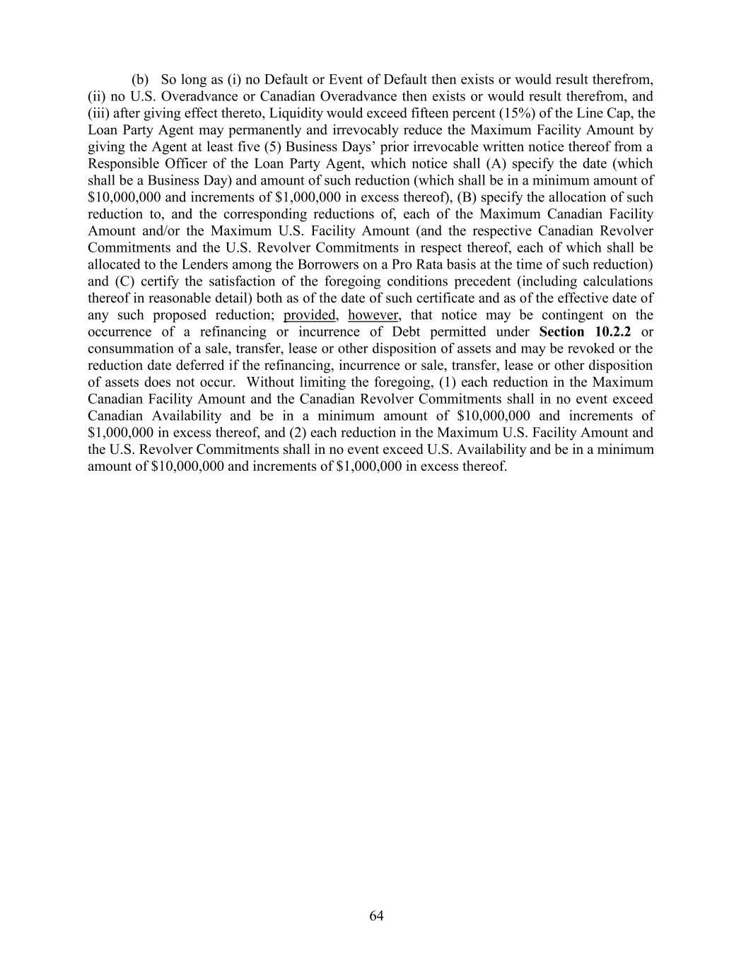 (b) So long as (i) no Default or Event of Default then exists or would result therefrom, (ii) no U.S. Overadvance or Canadian Overadvance then exists or would result therefrom, and (iii) after giving effect thereto, Liquidity would exceed fifteen percent (15%) of the Line Cap, the Loan Party Agent may permanently and irrevocably reduce the Maximum Facility Amount by giving the Agent at least five (5) Business Days’ prior irrevocable written notice thereof from a Responsible Officer of the Loan Party Agent, which notice shall (A) specify the date (which shall be a Business Day) and amount of such reduction (which shall be in a minimum amount of $10,000,000 and increments of $1,000,000 in excess thereof), (B) specify the allocation of such reduction to, and the corresponding reductions of, each of the Maximum Canadian Facility Amount and/or the Maximum U.S. Facility Amount (and the respective Canadian Revolver Commitments and the U.S. Revolver Commitments in respect thereof, each of which shall be allocated to the Lenders among the Borrowers on a Pro Rata basis at the time of such reduction) and (C) certify the satisfaction of the foregoing conditions precedent (including calculations thereof in reasonable detail) both as of the date of such certificate and as of the effective date of any such proposed reduction; provided, however, that notice may be contingent on the occurrence of a refinancing or incurrence of Debt permitted under Section 10.2.2 or consummation of a sale, transfer, lease or other disposition of assets and may be revoked or the reduction date deferred if the refinancing, incurrence or sale, transfer, lease or other disposition of assets does not occur. Without limiting the foregoing, (1) each reduction in the Maximum Canadian Facility Amount and the Canadian Revolver Commitments shall in no event exceed Canadian Availability and be in a minimum amount of $10,000,000 and increments of $1,000,000 in excess thereof, and (2) each reduction in the Maximum U.S. Facility Amount and the U.S. Revolver Commitments shall in no event exceed U.S. Availability and be in a minimum amount of $10,000,000 and increments of $1,000,000 in excess thereof. 64