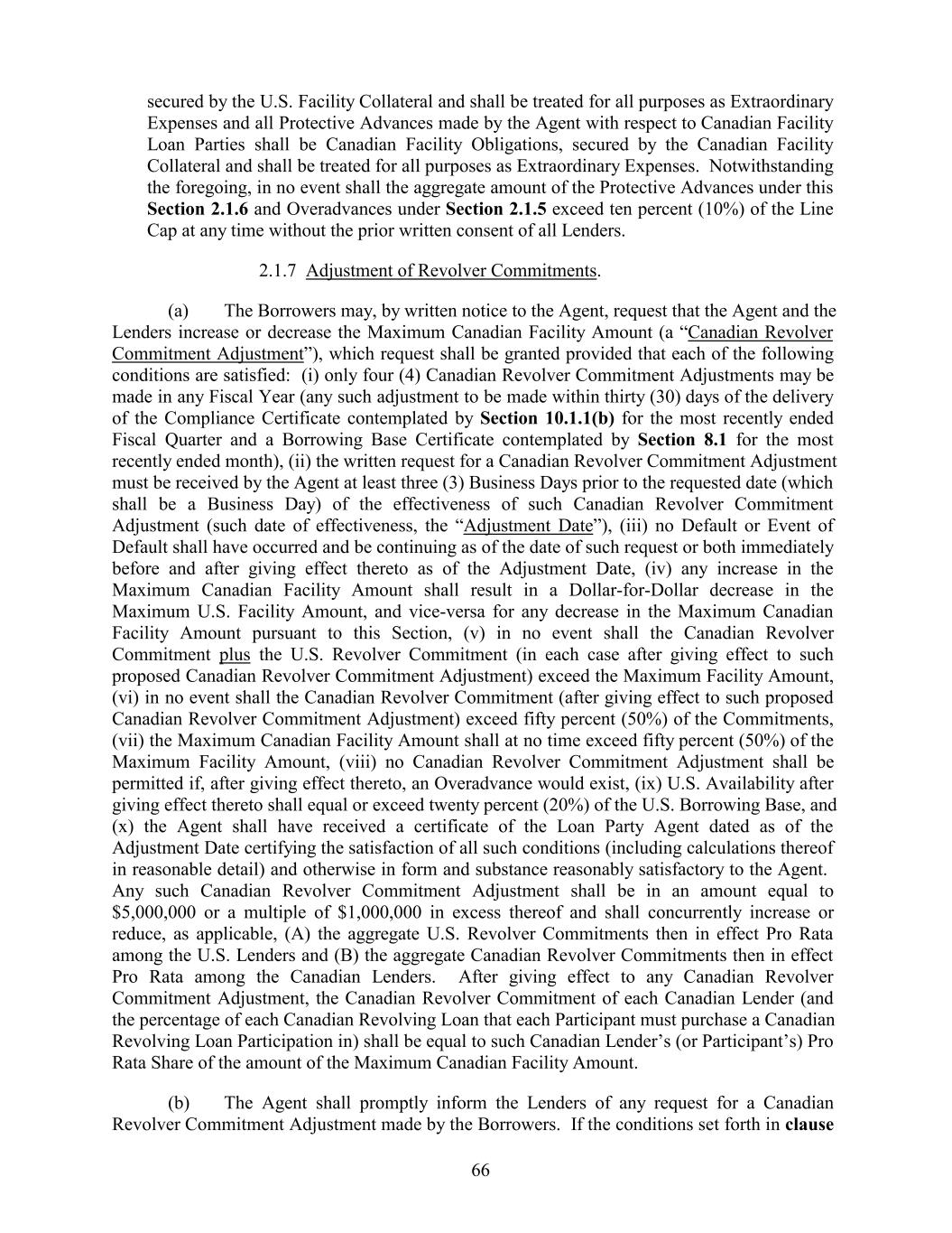 secured by the U.S. Facility Collateral and shall be treated for all purposes as Extraordinary Expenses and all Protective Advances made by the Agent with respect to Canadian Facility Loan Parties shall be Canadian Facility Obligations, secured by the Canadian Facility Collateral and shall be treated for all purposes as Extraordinary Expenses. Notwithstanding the foregoing, in no event shall the aggregate amount of the Protective Advances under this Section 2.1.6 and Overadvances under Section 2.1.5 exceed ten percent (10%) of the Line Cap at any time without the prior written consent of all Lenders. 2.1.7 Adjustment of Revolver Commitments. (a) The Borrowers may, by written notice to the Agent, request that the Agent and the Lenders increase or decrease the Maximum Canadian Facility Amount (a “Canadian Revolver Commitment Adjustment”), which request shall be granted provided that each of the following conditions are satisfied: (i) only four (4) Canadian Revolver Commitment Adjustments may be made in any Fiscal Year (any such adjustment to be made within thirty (30) days of the delivery of the Compliance Certificate contemplated by Section 10.1.1(b) for the most recently ended Fiscal Quarter and a Borrowing Base Certificate contemplated by Section 8.1 for the most recently ended month), (ii) the written request for a Canadian Revolver Commitment Adjustment must be received by the Agent at least three (3) Business Days prior to the requested date (which shall be a Business Day) of the effectiveness of such Canadian Revolver Commitment Adjustment (such date of effectiveness, the “Adjustment Date”), (iii) no Default or Event of Default shall have occurred and be continuing as of the date of such request or both immediately before and after giving effect thereto as of the Adjustment Date, (iv) any increase in the Maximum Canadian Facility Amount shall result in a Dollar-for-Dollar decrease in the Maximum U.S. Facility Amount, and vice-versa for any decrease in the Maximum Canadian Facility Amount pursuant to this Section, (v) in no event shall the Canadian Revolver Commitment plus the U.S. Revolver Commitment (in each case after giving effect to such proposed Canadian Revolver Commitment Adjustment) exceed the Maximum Facility Amount, (vi) in no event shall the Canadian Revolver Commitment (after giving effect to such proposed Canadian Revolver Commitment Adjustment) exceed fifty percent (50%) of the Commitments, (vii) the Maximum Canadian Facility Amount shall at no time exceed fifty percent (50%) of the Maximum Facility Amount, (viii) no Canadian Revolver Commitment Adjustment shall be permitted if, after giving effect thereto, an Overadvance would exist, (ix) U.S. Availability after giving effect thereto shall equal or exceed twenty percent (20%) of the U.S. Borrowing Base, and (x) the Agent shall have received a certificate of the Loan Party Agent dated as of the Adjustment Date certifying the satisfaction of all such conditions (including calculations thereof in reasonable detail) and otherwise in form and substance reasonably satisfactory to the Agent. Any such Canadian Revolver Commitment Adjustment shall be in an amount equal to $5,000,000 or a multiple of $1,000,000 in excess thereof and shall concurrently increase or reduce, as applicable, (A) the aggregate U.S. Revolver Commitments then in effect Pro Rata among the U.S. Lenders and (B) the aggregate Canadian Revolver Commitments then in effect Pro Rata among the Canadian Lenders. After giving effect to any Canadian Revolver Commitment Adjustment, the Canadian Revolver Commitment of each Canadian Lender (and the percentage of each Canadian Revolving Loan that each Participant must purchase a Canadian Revolving Loan Participation in) shall be equal to such Canadian Lender’s (or Participant’s) Pro Rata Share of the amount of the Maximum Canadian Facility Amount. (b) The Agent shall promptly inform the Lenders of any request for a Canadian Revolver Commitment Adjustment made by the Borrowers. If the conditions set forth in clause 66