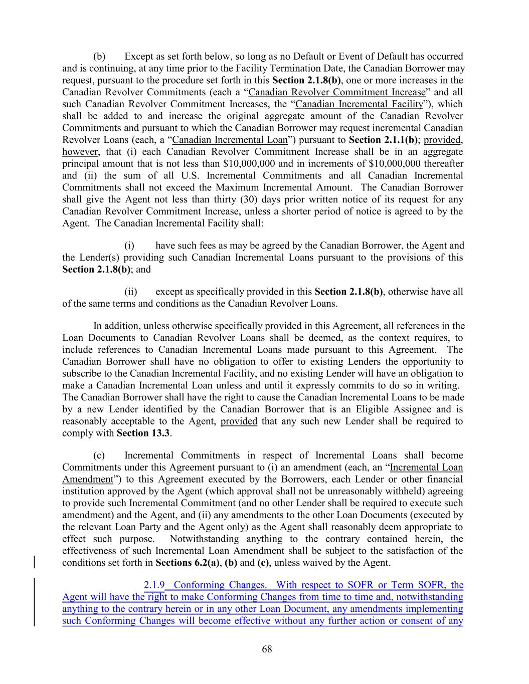 (b) Except as set forth below, so long as no Default or Event of Default has occurred and is continuing, at any time prior to the Facility Termination Date, the Canadian Borrower may request, pursuant to the procedure set forth in this Section 2.1.8(b), one or more increases in the Canadian Revolver Commitments (each a “Canadian Revolver Commitment Increase” and all such Canadian Revolver Commitment Increases, the “Canadian Incremental Facility”), which shall be added to and increase the original aggregate amount of the Canadian Revolver Commitments and pursuant to which the Canadian Borrower may request incremental Canadian Revolver Loans (each, a “Canadian Incremental Loan”) pursuant to Section 2.1.1(b); provided, however, that (i) each Canadian Revolver Commitment Increase shall be in an aggregate principal amount that is not less than $10,000,000 and in increments of $10,000,000 thereafter and (ii) the sum of all U.S. Incremental Commitments and all Canadian Incremental Commitments shall not exceed the Maximum Incremental Amount. The Canadian Borrower shall give the Agent not less than thirty (30) days prior written notice of its request for any Canadian Revolver Commitment Increase, unless a shorter period of notice is agreed to by the Agent. The Canadian Incremental Facility shall: (i) have such fees as may be agreed by the Canadian Borrower, the Agent and the Lender(s) providing such Canadian Incremental Loans pursuant to the provisions of this Section 2.1.8(b); and (ii) except as specifically provided in this Section 2.1.8(b), otherwise have all of the same terms and conditions as the Canadian Revolver Loans. In addition, unless otherwise specifically provided in this Agreement, all references in the Loan Documents to Canadian Revolver Loans shall be deemed, as the context requires, to include references to Canadian Incremental Loans made pursuant to this Agreement. The Canadian Borrower shall have no obligation to offer to existing Lenders the opportunity to subscribe to the Canadian Incremental Facility, and no existing Lender will have an obligation to make a Canadian Incremental Loan unless and until it expressly commits to do so in writing. The Canadian Borrower shall have the right to cause the Canadian Incremental Loans to be made by a new Lender identified by the Canadian Borrower that is an Eligible Assignee and is reasonably acceptable to the Agent, provided that any such new Lender shall be required to comply with Section 13.3. (c) Incremental Commitments in respect of Incremental Loans shall become Commitments under this Agreement pursuant to (i) an amendment (each, an “Incremental Loan Amendment”) to this Agreement executed by the Borrowers, each Lender or other financial institution approved by the Agent (which approval shall not be unreasonably withheld) agreeing to provide such Incremental Commitment (and no other Lender shall be required to execute such amendment) and the Agent, and (ii) any amendments to the other Loan Documents (executed by the relevant Loan Party and the Agent only) as the Agent shall reasonably deem appropriate to effect such purpose. Notwithstanding anything to the contrary contained herein, the effectiveness of such Incremental Loan Amendment shall be subject to the satisfaction of the conditions set forth in Sections 6.2(a), (b) and (c), unless waived by the Agent. 2.1.9 Conforming Changes. With respect to SOFR or Term SOFR, the Agent will have the right to make Conforming Changes from time to time and, notwithstanding anything to the contrary herein or in any other Loan Document, any amendments implementing such Conforming Changes will become effective without any further action or consent of any 68