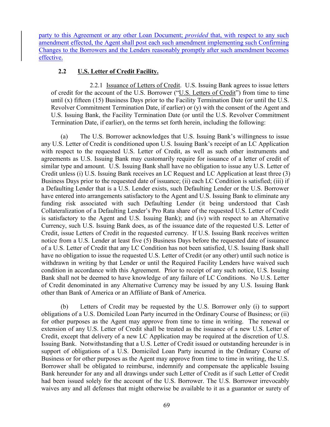 party to this Agreement or any other Loan Document; provided that, with respect to any such amendment effected, the Agent shall post each such amendment implementing such Confirming Changes to the Borrowers and the Lenders reasonably promptly after such amendment becomes effective. 2.2 U.S. Letter of Credit Facility. 2.2.1 Issuance of Letters of Credit. U.S. Issuing Bank agrees to issue letters of credit for the account of the U.S. Borrower (“U.S. Letters of Credit”) from time to time until (x) fifteen (15) Business Days prior to the Facility Termination Date (or until the U.S. Revolver Commitment Termination Date, if earlier) or (y) with the consent of the Agent and U.S. Issuing Bank, the Facility Termination Date (or until the U.S. Revolver Commitment Termination Date, if earlier), on the terms set forth herein, including the following: (a) The U.S. Borrower acknowledges that U.S. Issuing Bank’s willingness to issue any U.S. Letter of Credit is conditioned upon U.S. Issuing Bank’s receipt of an LC Application with respect to the requested U.S. Letter of Credit, as well as such other instruments and agreements as U.S. Issuing Bank may customarily require for issuance of a letter of credit of similar type and amount. U.S. Issuing Bank shall have no obligation to issue any U.S. Letter of Credit unless (i) U.S. Issuing Bank receives an LC Request and LC Application at least three (3) Business Days prior to the requested date of issuance; (ii) each LC Condition is satisfied; (iii) if a Defaulting Lender that is a U.S. Lender exists, such Defaulting Lender or the U.S. Borrower have entered into arrangements satisfactory to the Agent and U.S. Issuing Bank to eliminate any funding risk associated with such Defaulting Lender (it being understood that Cash Collateralization of a Defaulting Lender’s Pro Rata share of the requested U.S. Letter of Credit is satisfactory to the Agent and U.S. Issuing Bank); and (iv) with respect to an Alternative Currency, such U.S. Issuing Bank does, as of the issuance date of the requested U.S. Letter of Credit, issue Letters of Credit in the requested currency. If U.S. Issuing Bank receives written notice from a U.S. Lender at least five (5) Business Days before the requested date of issuance of a U.S. Letter of Credit that any LC Condition has not been satisfied, U.S. Issuing Bank shall have no obligation to issue the requested U.S. Letter of Credit (or any other) until such notice is withdrawn in writing by that Lender or until the Required Facility Lenders have waived such condition in accordance with this Agreement. Prior to receipt of any such notice, U.S. Issuing Bank shall not be deemed to have knowledge of any failure of LC Conditions. No U.S. Letter of Credit denominated in any Alternative Currency may be issued by any U.S. Issuing Bank other than Bank of America or an Affiliate of Bank of America. (b) Letters of Credit may be requested by the U.S. Borrower only (i) to support obligations of a U.S. Domiciled Loan Party incurred in the Ordinary Course of Business; or (ii) for other purposes as the Agent may approve from time to time in writing. The renewal or extension of any U.S. Letter of Credit shall be treated as the issuance of a new U.S. Letter of Credit, except that delivery of a new LC Application may be required at the discretion of U.S. Issuing Bank. Notwithstanding that a U.S. Letter of Credit issued or outstanding hereunder is in support of obligations of a U.S. Domiciled Loan Party incurred in the Ordinary Course of Business or for other purposes as the Agent may approve from time to time in writing, the U.S. Borrower shall be obligated to reimburse, indemnify and compensate the applicable Issuing Bank hereunder for any and all drawings under such Letter of Credit as if such Letter of Credit had been issued solely for the account of the U.S. Borrower. The U.S. Borrower irrevocably waives any and all defenses that might otherwise be available to it as a guarantor or surety of 69