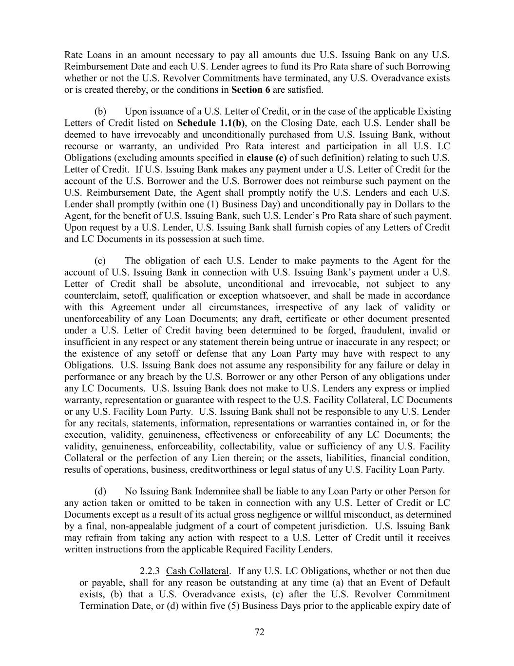 Rate Loans in an amount necessary to pay all amounts due U.S. Issuing Bank on any U.S. Reimbursement Date and each U.S. Lender agrees to fund its Pro Rata share of such Borrowing whether or not the U.S. Revolver Commitments have terminated, any U.S. Overadvance exists or is created thereby, or the conditions in Section 6 are satisfied. (b) Upon issuance of a U.S. Letter of Credit, or in the case of the applicable Existing Letters of Credit listed on Schedule 1.1(b), on the Closing Date, each U.S. Lender shall be deemed to have irrevocably and unconditionally purchased from U.S. Issuing Bank, without recourse or warranty, an undivided Pro Rata interest and participation in all U.S. LC Obligations (excluding amounts specified in clause (c) of such definition) relating to such U.S. Letter of Credit. If U.S. Issuing Bank makes any payment under a U.S. Letter of Credit for the account of the U.S. Borrower and the U.S. Borrower does not reimburse such payment on the U.S. Reimbursement Date, the Agent shall promptly notify the U.S. Lenders and each U.S. Lender shall promptly (within one (1) Business Day) and unconditionally pay in Dollars to the Agent, for the benefit of U.S. Issuing Bank, such U.S. Lender’s Pro Rata share of such payment. Upon request by a U.S. Lender, U.S. Issuing Bank shall furnish copies of any Letters of Credit and LC Documents in its possession at such time. (c) The obligation of each U.S. Lender to make payments to the Agent for the account of U.S. Issuing Bank in connection with U.S. Issuing Bank’s payment under a U.S. Letter of Credit shall be absolute, unconditional and irrevocable, not subject to any counterclaim, setoff, qualification or exception whatsoever, and shall be made in accordance with this Agreement under all circumstances, irrespective of any lack of validity or unenforceability of any Loan Documents; any draft, certificate or other document presented under a U.S. Letter of Credit having been determined to be forged, fraudulent, invalid or insufficient in any respect or any statement therein being untrue or inaccurate in any respect; or the existence of any setoff or defense that any Loan Party may have with respect to any Obligations. U.S. Issuing Bank does not assume any responsibility for any failure or delay in performance or any breach by the U.S. Borrower or any other Person of any obligations under any LC Documents. U.S. Issuing Bank does not make to U.S. Lenders any express or implied warranty, representation or guarantee with respect to the U.S. Facility Collateral, LC Documents or any U.S. Facility Loan Party. U.S. Issuing Bank shall not be responsible to any U.S. Lender for any recitals, statements, information, representations or warranties contained in, or for the execution, validity, genuineness, effectiveness or enforceability of any LC Documents; the validity, genuineness, enforceability, collectability, value or sufficiency of any U.S. Facility Collateral or the perfection of any Lien therein; or the assets, liabilities, financial condition, results of operations, business, creditworthiness or legal status of any U.S. Facility Loan Party. (d) No Issuing Bank Indemnitee shall be liable to any Loan Party or other Person for any action taken or omitted to be taken in connection with any U.S. Letter of Credit or LC Documents except as a result of its actual gross negligence or willful misconduct, as determined by a final, non-appealable judgment of a court of competent jurisdiction. U.S. Issuing Bank may refrain from taking any action with respect to a U.S. Letter of Credit until it receives written instructions from the applicable Required Facility Lenders. 2.2.3 Cash Collateral. If any U.S. LC Obligations, whether or not then due or payable, shall for any reason be outstanding at any time (a) that an Event of Default exists, (b) that a U.S. Overadvance exists, (c) after the U.S. Revolver Commitment Termination Date, or (d) within five (5) Business Days prior to the applicable expiry date of 72
