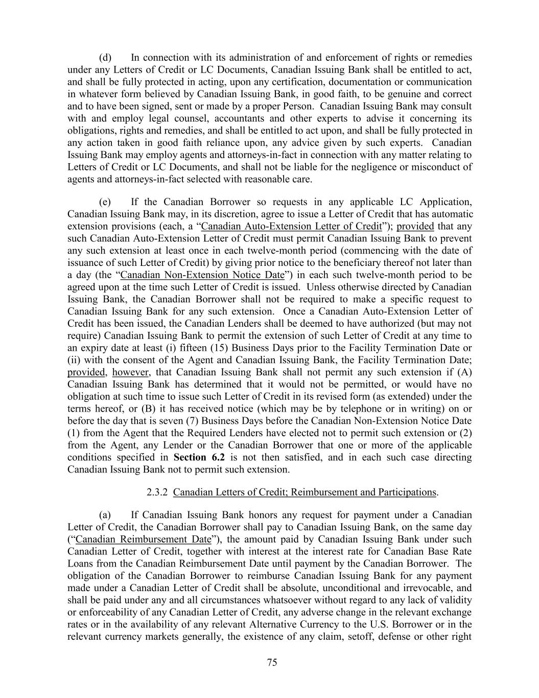 (d) In connection with its administration of and enforcement of rights or remedies under any Letters of Credit or LC Documents, Canadian Issuing Bank shall be entitled to act, and shall be fully protected in acting, upon any certification, documentation or communication in whatever form believed by Canadian Issuing Bank, in good faith, to be genuine and correct and to have been signed, sent or made by a proper Person. Canadian Issuing Bank may consult with and employ legal counsel, accountants and other experts to advise it concerning its obligations, rights and remedies, and shall be entitled to act upon, and shall be fully protected in any action taken in good faith reliance upon, any advice given by such experts. Canadian Issuing Bank may employ agents and attorneys-in-fact in connection with any matter relating to Letters of Credit or LC Documents, and shall not be liable for the negligence or misconduct of agents and attorneys-in-fact selected with reasonable care. (e) If the Canadian Borrower so requests in any applicable LC Application, Canadian Issuing Bank may, in its discretion, agree to issue a Letter of Credit that has automatic extension provisions (each, a “Canadian Auto-Extension Letter of Credit”); provided that any such Canadian Auto-Extension Letter of Credit must permit Canadian Issuing Bank to prevent any such extension at least once in each twelve-month period (commencing with the date of issuance of such Letter of Credit) by giving prior notice to the beneficiary thereof not later than a day (the “Canadian Non-Extension Notice Date”) in each such twelve-month period to be agreed upon at the time such Letter of Credit is issued. Unless otherwise directed by Canadian Issuing Bank, the Canadian Borrower shall not be required to make a specific request to Canadian Issuing Bank for any such extension. Once a Canadian Auto-Extension Letter of Credit has been issued, the Canadian Lenders shall be deemed to have authorized (but may not require) Canadian Issuing Bank to permit the extension of such Letter of Credit at any time to an expiry date at least (i) fifteen (15) Business Days prior to the Facility Termination Date or (ii) with the consent of the Agent and Canadian Issuing Bank, the Facility Termination Date; provided, however, that Canadian Issuing Bank shall not permit any such extension if (A) Canadian Issuing Bank has determined that it would not be permitted, or would have no obligation at such time to issue such Letter of Credit in its revised form (as extended) under the terms hereof, or (B) it has received notice (which may be by telephone or in writing) on or before the day that is seven (7) Business Days before the Canadian Non-Extension Notice Date (1) from the Agent that the Required Lenders have elected not to permit such extension or (2) from the Agent, any Lender or the Canadian Borrower that one or more of the applicable conditions specified in Section 6.2 is not then satisfied, and in each such case directing Canadian Issuing Bank not to permit such extension. 2.3.2 Canadian Letters of Credit; Reimbursement and Participations. (a) If Canadian Issuing Bank honors any request for payment under a Canadian Letter of Credit, the Canadian Borrower shall pay to Canadian Issuing Bank, on the same day (“Canadian Reimbursement Date”), the amount paid by Canadian Issuing Bank under such Canadian Letter of Credit, together with interest at the interest rate for Canadian Base Rate Loans from the Canadian Reimbursement Date until payment by the Canadian Borrower. The obligation of the Canadian Borrower to reimburse Canadian Issuing Bank for any payment made under a Canadian Letter of Credit shall be absolute, unconditional and irrevocable, and shall be paid under any and all circumstances whatsoever without regard to any lack of validity or enforceability of any Canadian Letter of Credit, any adverse change in the relevant exchange rates or in the availability of any relevant Alternative Currency to the U.S. Borrower or in the relevant currency markets generally, the existence of any claim, setoff, defense or other right 75