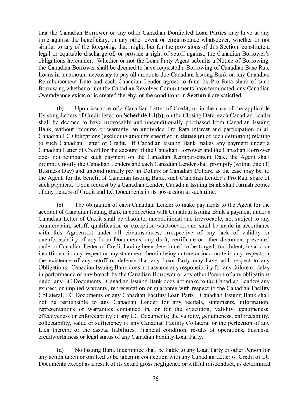 that the Canadian Borrower or any other Canadian Domiciled Loan Parties may have at any time against the beneficiary, or any other event or circumstance whatsoever, whether or not similar to any of the foregoing, that might, but for the provisions of this Section, constitute a legal or equitable discharge of, or provide a right of setoff against, the Canadian Borrower’s obligations hereunder. Whether or not the Loan Party Agent submits a Notice of Borrowing, the Canadian Borrower shall be deemed to have requested a Borrowing of Canadian Base Rate Loans in an amount necessary to pay all amounts due Canadian Issuing Bank on any Canadian Reimbursement Date and each Canadian Lender agrees to fund its Pro Rata share of such Borrowing whether or not the Canadian Revolver Commitments have terminated, any Canadian Overadvance exists or is created thereby, or the conditions in Section 6 are satisfied. (b) Upon issuance of a Canadian Letter of Credit, or in the case of the applicable Existing Letters of Credit listed on Schedule 1.1(b), on the Closing Date, each Canadian Lender shall be deemed to have irrevocably and unconditionally purchased from Canadian Issuing Bank, without recourse or warranty, an undivided Pro Rata interest and participation in all Canadian LC Obligations (excluding amounts specified in clause (c) of such definition) relating to such Canadian Letter of Credit. If Canadian Issuing Bank makes any payment under a Canadian Letter of Credit for the account of the Canadian Borrower and the Canadian Borrower does not reimburse such payment on the Canadian Reimbursement Date, the Agent shall promptly notify the Canadian Lenders and each Canadian Lender shall promptly (within one (1) Business Day) and unconditionally pay in Dollars or Canadian Dollars, as the case may be, to the Agent, for the benefit of Canadian Issuing Bank, such Canadian Lender’s Pro Rata share of such payment. Upon request by a Canadian Lender, Canadian Issuing Bank shall furnish copies of any Letters of Credit and LC Documents in its possession at such time. (c) The obligation of each Canadian Lender to make payments to the Agent for the account of Canadian Issuing Bank in connection with Canadian Issuing Bank’s payment under a Canadian Letter of Credit shall be absolute, unconditional and irrevocable, not subject to any counterclaim, setoff, qualification or exception whatsoever, and shall be made in accordance with this Agreement under all circumstances, irrespective of any lack of validity or unenforceability of any Loan Documents; any draft, certificate or other document presented under a Canadian Letter of Credit having been determined to be forged, fraudulent, invalid or insufficient in any respect or any statement therein being untrue or inaccurate in any respect; or the existence of any setoff or defense that any Loan Party may have with respect to any Obligations. Canadian Issuing Bank does not assume any responsibility for any failure or delay in performance or any breach by the Canadian Borrower or any other Person of any obligations under any LC Documents. Canadian Issuing Bank does not make to the Canadian Lenders any express or implied warranty, representation or guarantee with respect to the Canadian Facility Collateral, LC Documents or any Canadian Facility Loan Party. Canadian Issuing Bank shall not be responsible to any Canadian Lender for any recitals, statements, information, representations or warranties contained in, or for the execution, validity, genuineness, effectiveness or enforceability of any LC Documents; the validity, genuineness, enforceability, collectability, value or sufficiency of any Canadian Facility Collateral or the perfection of any Lien therein; or the assets, liabilities, financial condition, results of operations, business, creditworthiness or legal status of any Canadian Facility Loan Party. (d) No Issuing Bank Indemnitee shall be liable to any Loan Party or other Person for any action taken or omitted to be taken in connection with any Canadian Letter of Credit or LC Documents except as a result of its actual gross negligence or willful misconduct, as determined 76